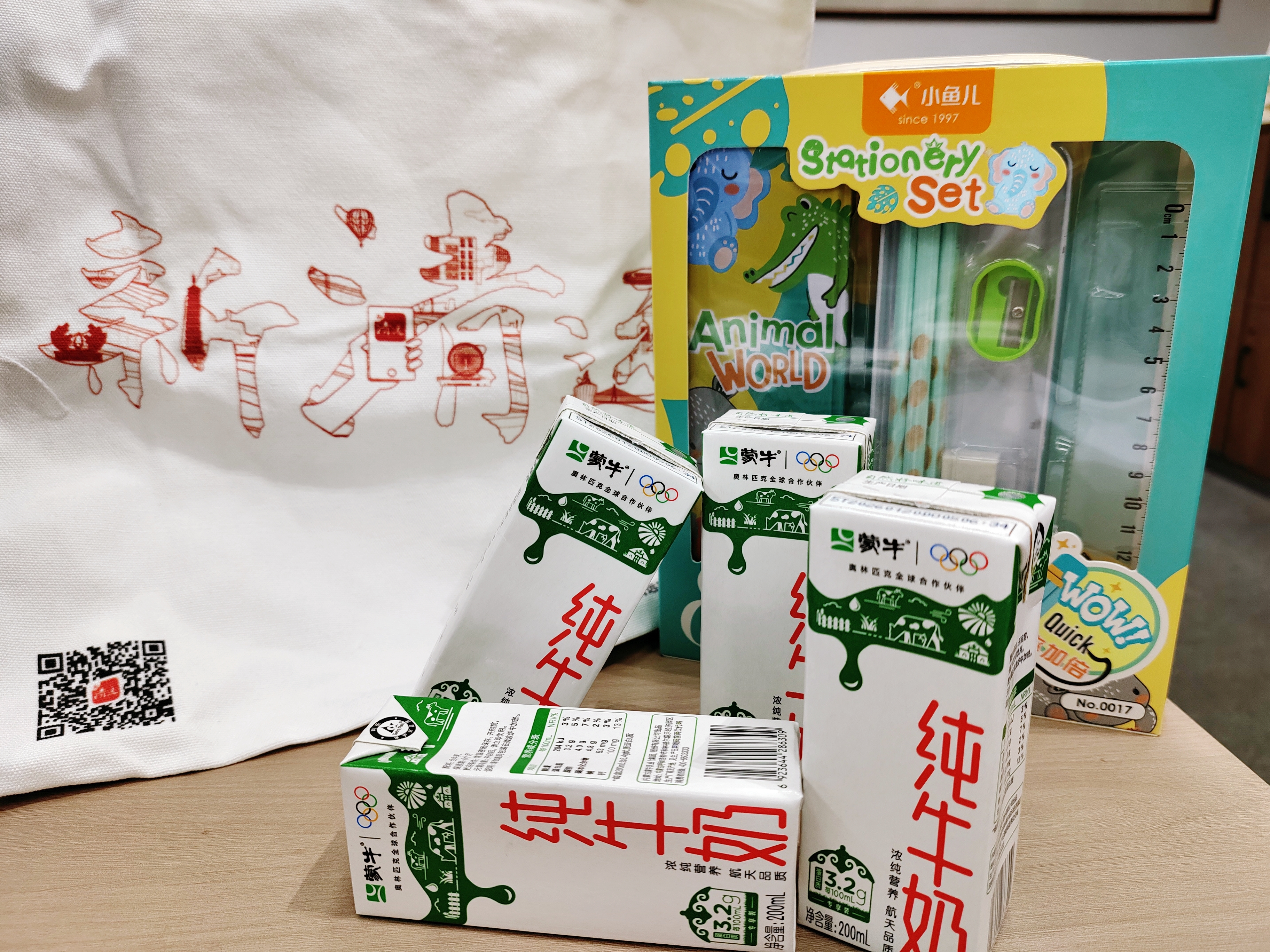 本月礼品是文具+牛奶+帆布袋