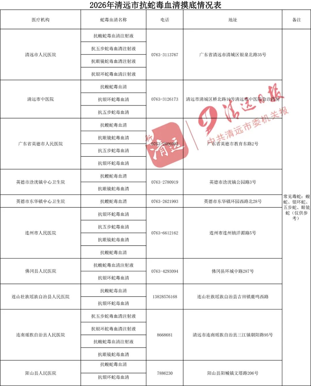 清远这10家医院有储备抗蛇毒血清