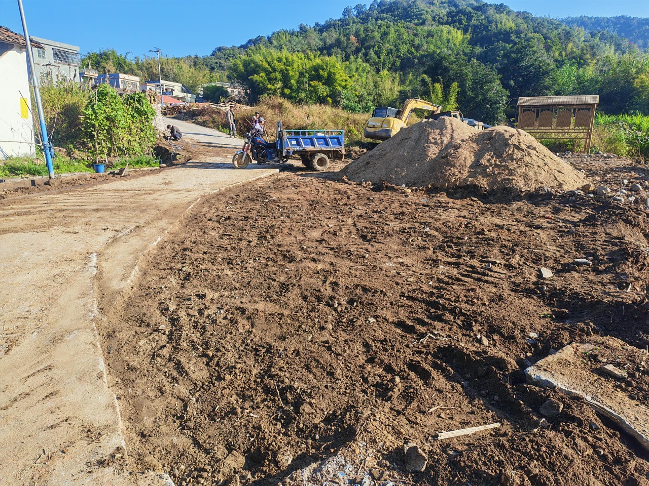 这种“三个一点三不补”的模式,也让乌城村土屋组深受启发,在上级党组织和驻村团队的支持下,当地的硬底化改造项目由镇政府支持水泥21吨和钩机台班(价值约1万元),村民自筹砂石、机械费用约1.2万元,10名村民义务投工。仅用一周,完成400平方米闲置空地硬底化工程。