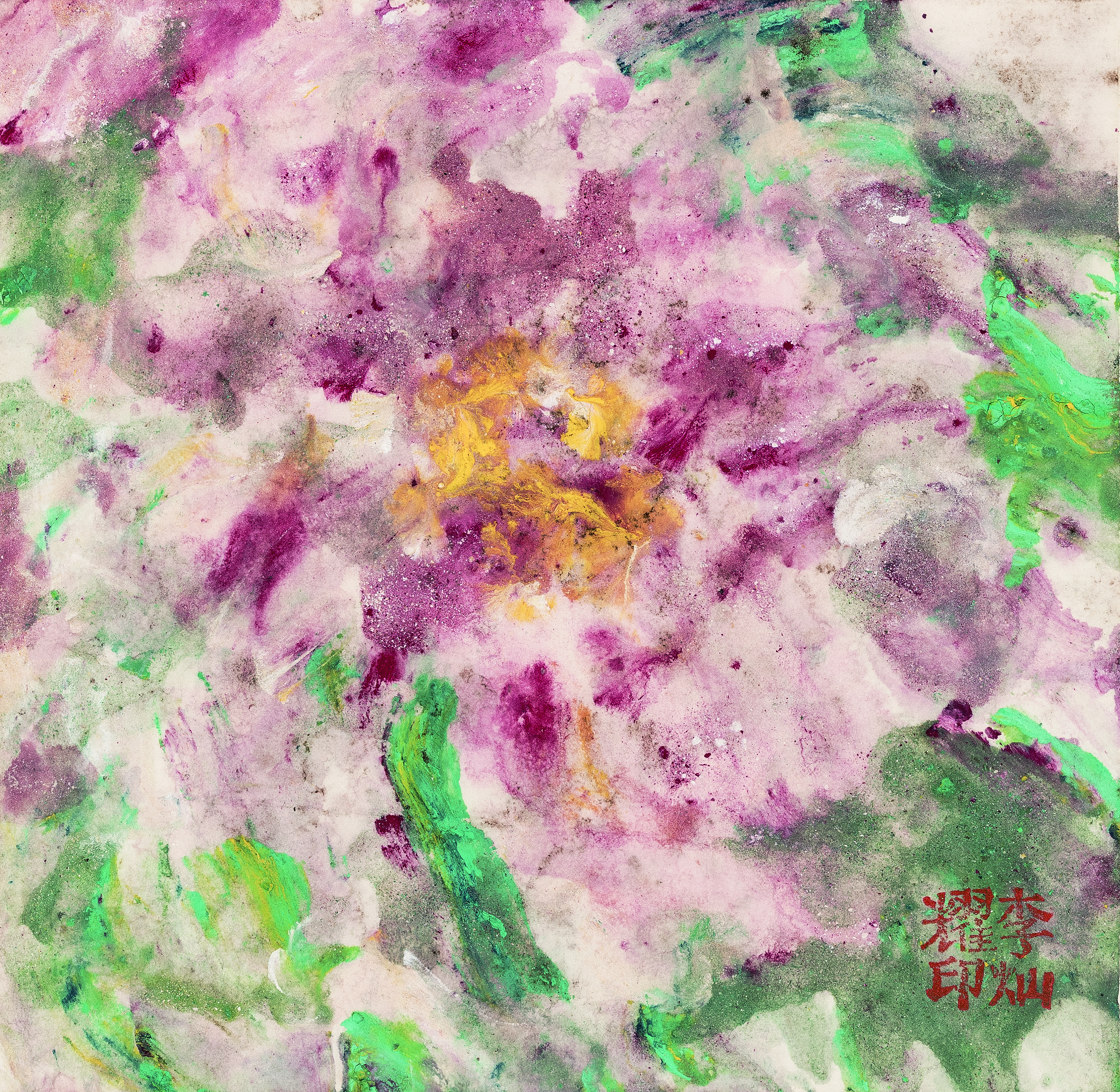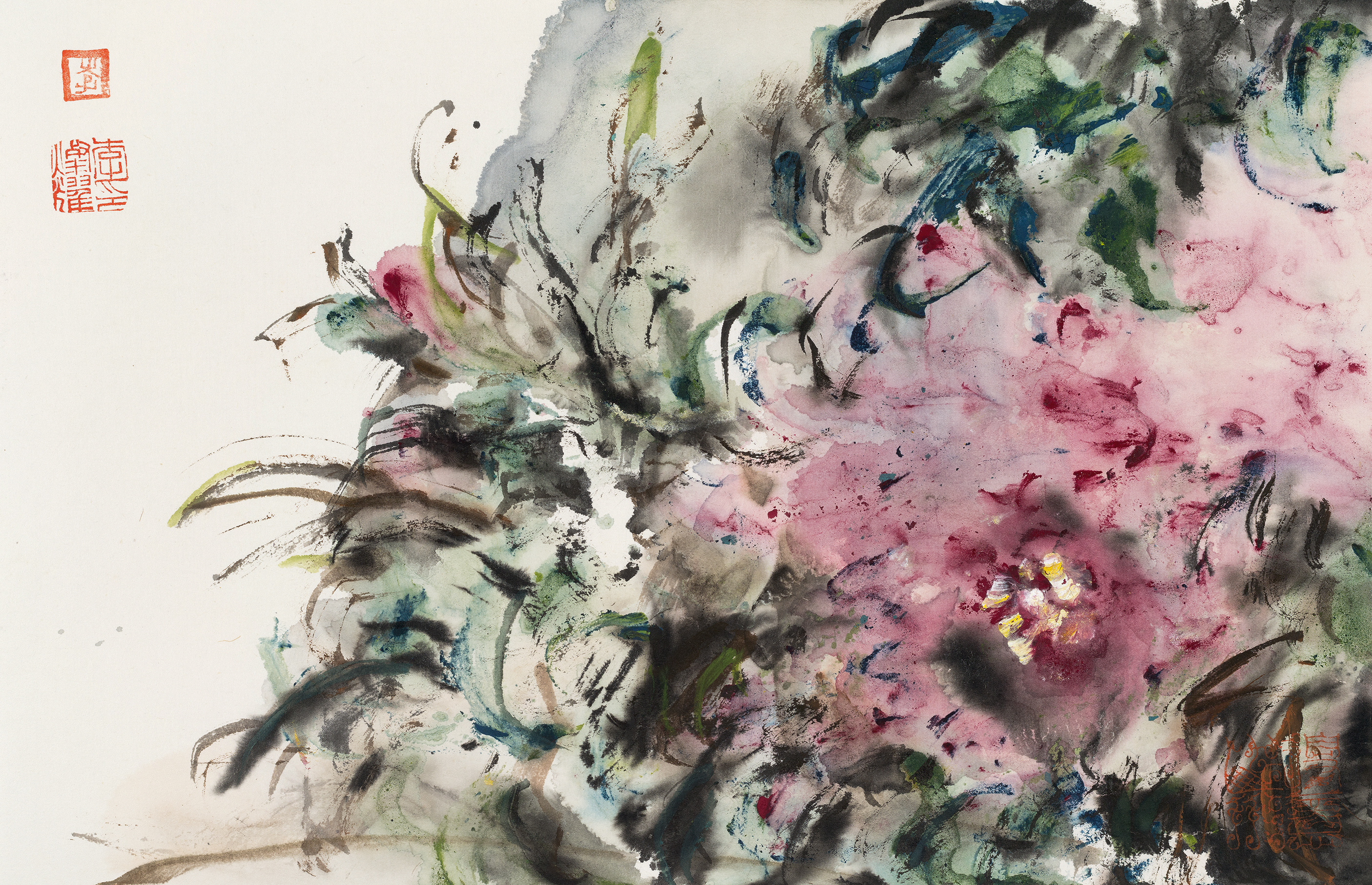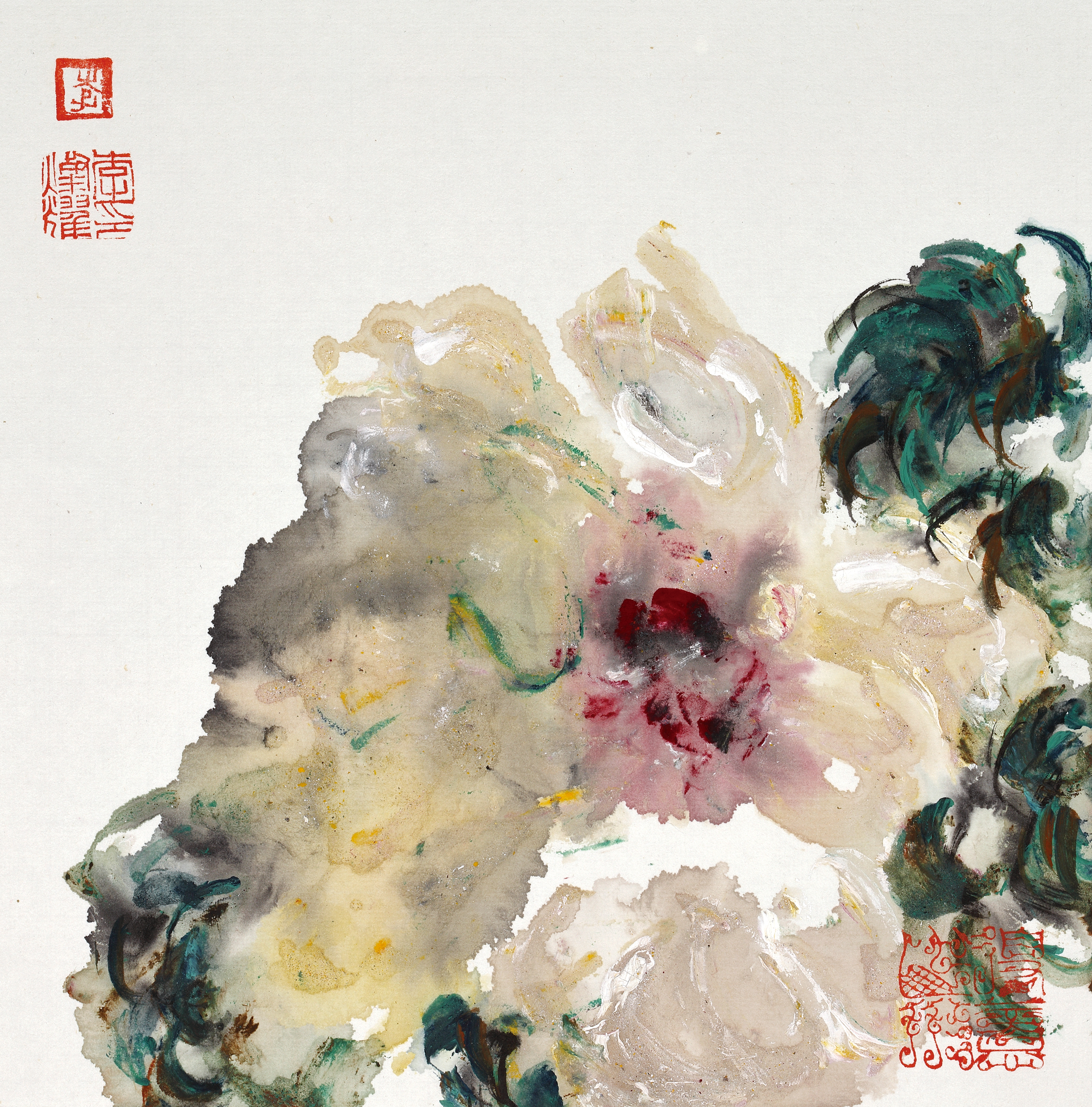 三系色墨交响,艳而不俗。古人论画牡丹,最忌火气、俗气。灿耀善以石绿、胭脂、浓墨相融,色彩浓郁而沉着,于浓艳中见雅致,于斑斓中求统一。更善用水法,使墨色在宣纸上自然幻化,生出千万变化,遂成独特面貌。其牡丹清新脱俗,色彩丰富,变化微妙。