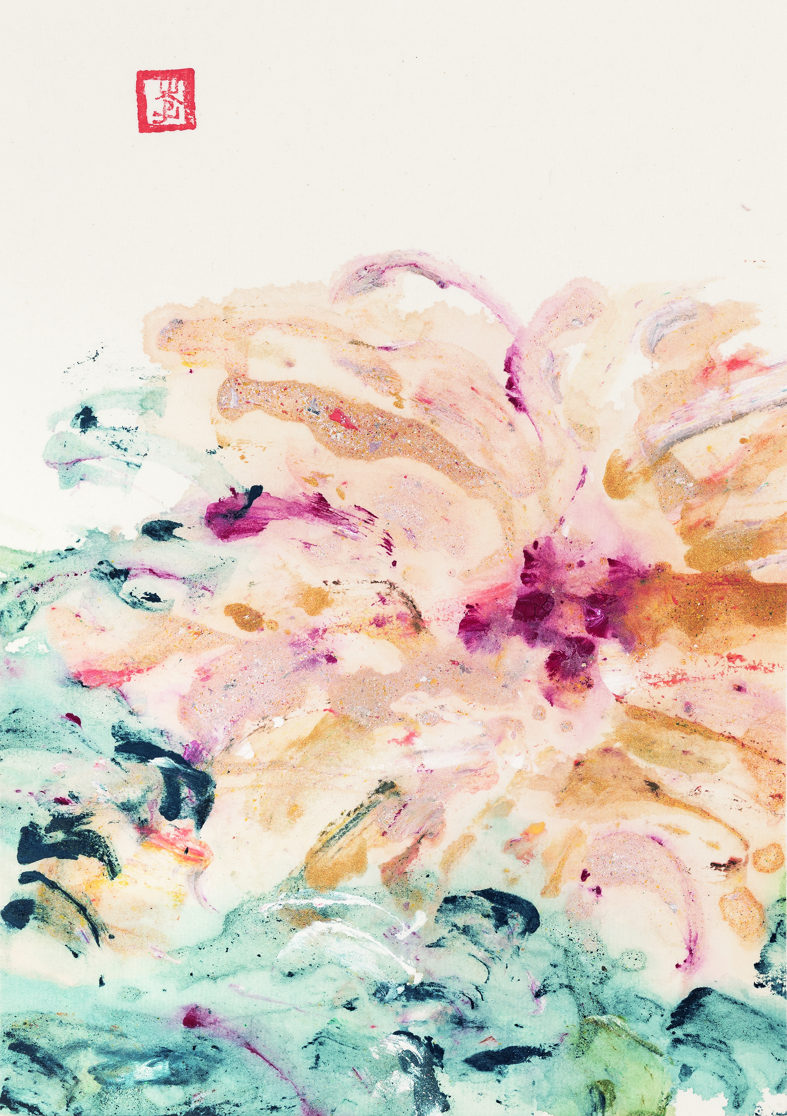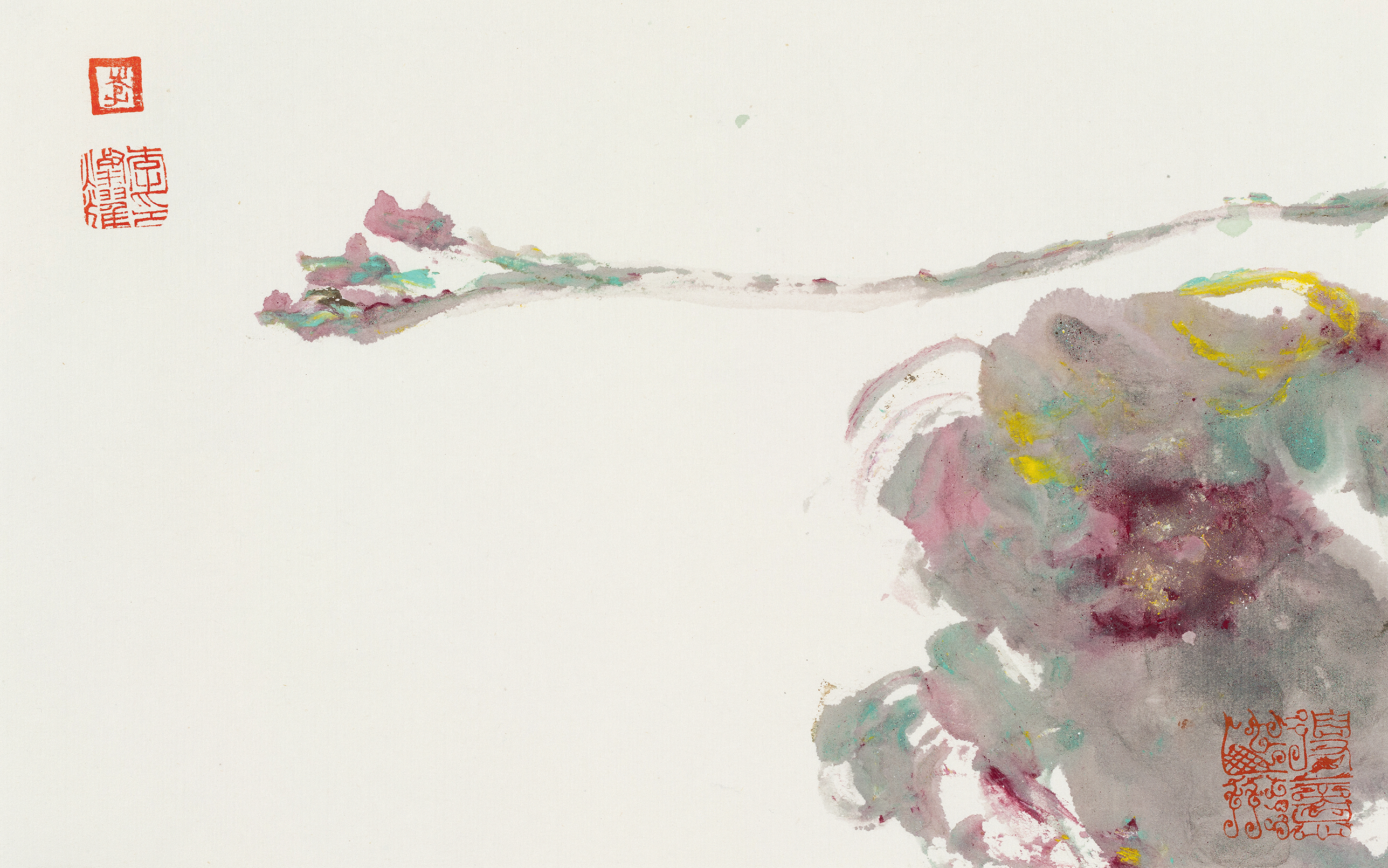 二系笔纵墨恣,破形得意。其画大写意行之,放得开,够大胆,甚至“任性妄为”。用笔纵横挥洒,不拘形似,务求痛快淋漓。笔下“一花一物”,重形式与色彩的突破,不为形拘,笔、墨、水、色交织无羁,呈现强烈视觉张力与当代审美意趣。此与古来牡丹画严谨工致、雍容华贵的范式大异其趣。