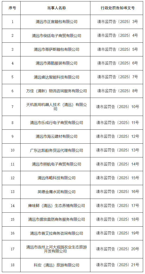 近日,清远市市场监督管理局发布行政处罚文书送达公告,该局于2025年11月17日依法对清远市海云建材有限公司等18户企业(以下简称当事人)下达《清远市市场监督管理局行政处罚告知书》,因无法通过直接或邮寄等方式送达,依据《市场监督管理行政处罚程序规定》第八十二条第五项的规定,该局决定依法向当事人公告送达《清远市市场监督管理局行政处罚告知书》。
