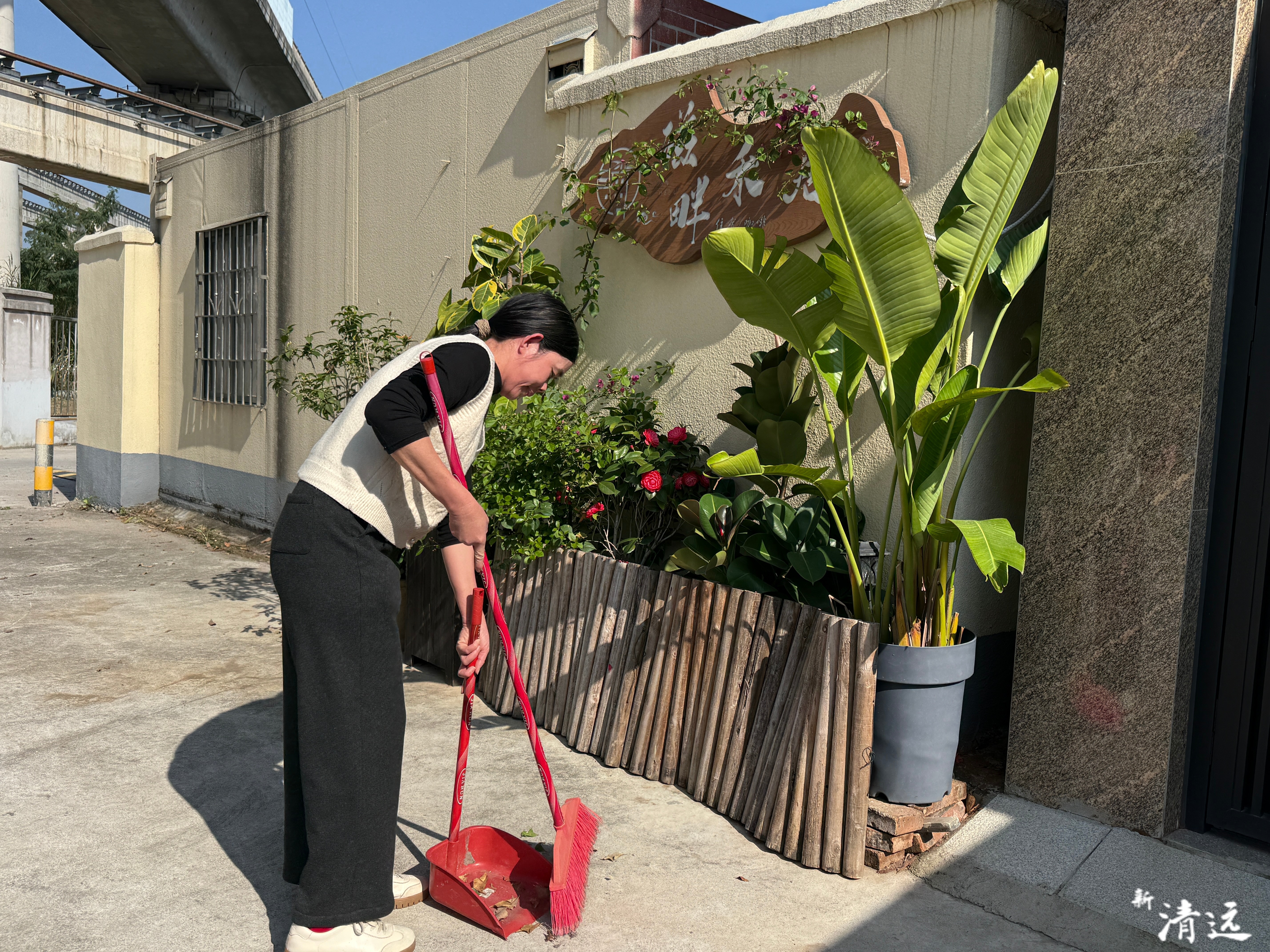 民宿工作人员做好门前保洁工作。