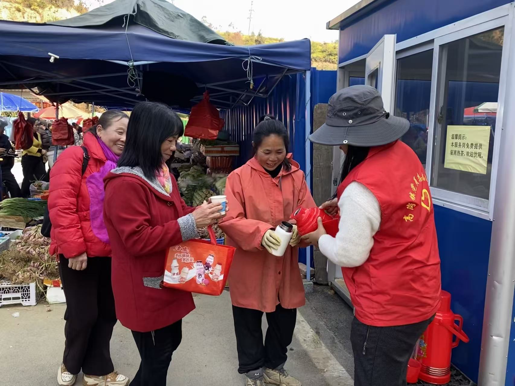 高岗镇党员志愿者为市场摊贩和买菜街坊派热姜茶。通讯员供图