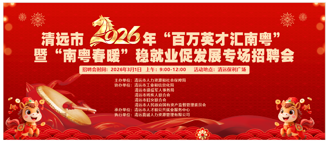 为进一步发挥人力资源和社会保障部门在保民生、稳就业、促发展中的重要作用,帮助企业和求职者搭建信息交流平台,促进高质量充分就业,清远市人力资源和社会保障局联合市工业和信息化局、市退役军人事务局、市残联、市妇联、市国资委等部门将于2026年3月1日(本周日),在清远保利广场举办清远市2026年“百万英才汇南粤”暨“南粤春暖”稳就业促发展专场招聘会。届时100多家优质企业提供超5000个就业岗位,欢迎广大求职者到现场参加。