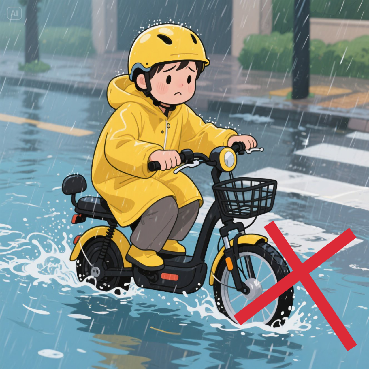 尽量避开有积水的路面,警惕积水下面可能隐藏有大坑、石头或者下水道井盖,容易陷入危险,且电动自行车涉水易导致电机、电池、控制器等部件进水损坏,应绕行或推行通过。
