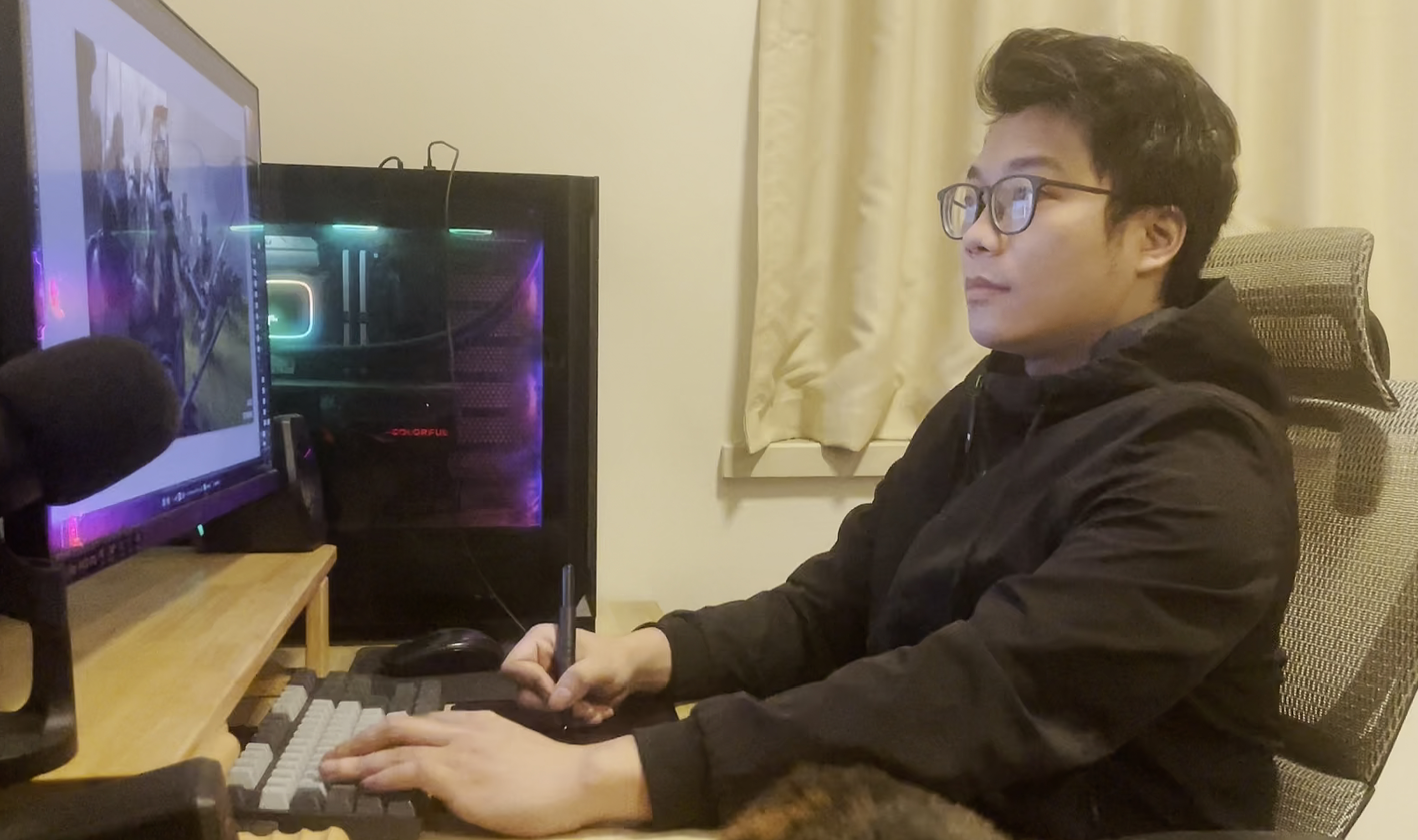 采访巫靖,几经相约方得见。被访者系游戏角色插画师,自由执业,居家而作,忙闲不定。若逢角色插画赶工,则焚膏继晷,日作逾十个钟;手头无案牍时,则悠游游戏之间。身为游戏设计参与者,其游于戏,亦乐在其中,可谓寓职于乐。