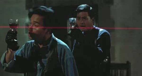 古堡偷画,穿行红外线——阿占和阿海在密密麻麻的红外线中轻盈穿梭。最经典的一幕,两人举着红酒杯,透过杯中红酒清晰看出展场内的红外线排布,然后一条条潇洒地穿过去。葡萄美酒夜光杯,在危机四伏的地方喝起了红酒——这一场景不仅成为华语影史最经典的桥段之一,也奠定了全片“优雅大盗”的独特基调。