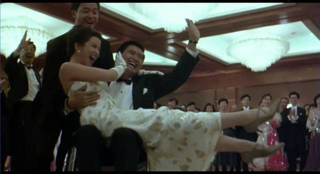 轮椅上的华尔兹——阿海坐在轮椅上与红豆共舞。两个人配合得天衣无缝,轮椅在他的操控下仿佛有了生命。那场戏,钟楚红笑得像春天的花。周润发坐在轮椅上旋转开枪的画面,已经成为影史经典。