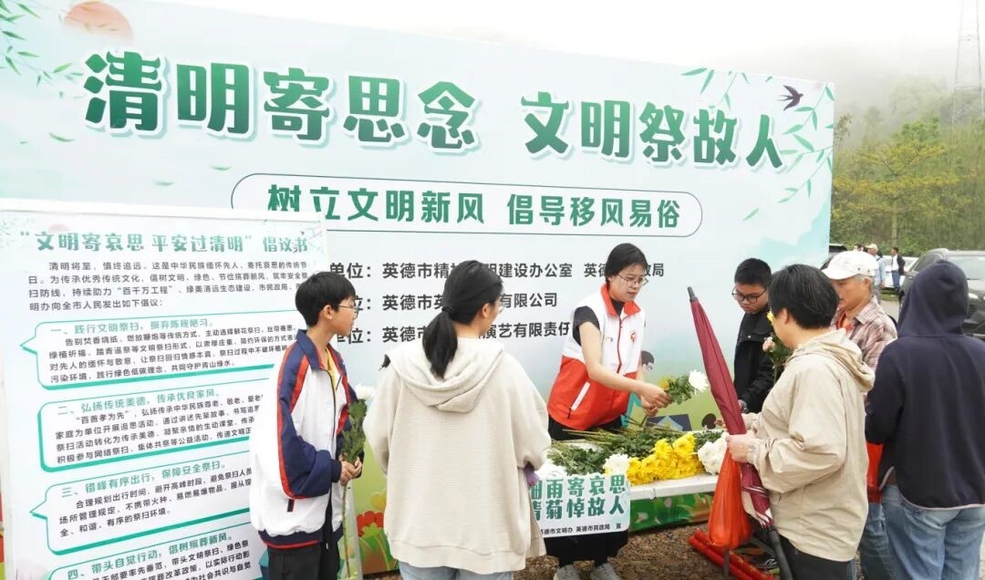忆清明祭英烈,传文明树新风。3月28日,佛冈县也举办了“我们的节日·清明”活动,组织居民以清明寄哀思,以书香祭英烈,弘扬文明祭扫的新风尚,推动红色基因、革命薪火代代相传。3月29日,由英德市文明办主办的“我们的节日·清明”主题活动相继开展——上午,英州陵园庄严肃穆,“清明寄思念 文明祭故人”的氛围格外浓厚。活动现场,工作人员为前来祭扫的群众免费派发鲜花,一束束素雅的鲜花,替代了传统纸钱鞭炮,成为寄托思念的新载体。志愿者们向市民发放“文明寄哀思 平安过清明”倡议书,耐心讲解移风易俗的意义,倡导大家以鲜花祭扫、集体追思等绿色环保方式缅怀先人。午后,阳光洒满英德市新时代文明实践中心,40对亲子家庭齐聚,赴一场“忆清明・承家风・润童心”的文化之约。在欢声笑语与文化浸润中,亲子们一同解锁清明的深层意蕴,让家风传承在互动中生根发芽。