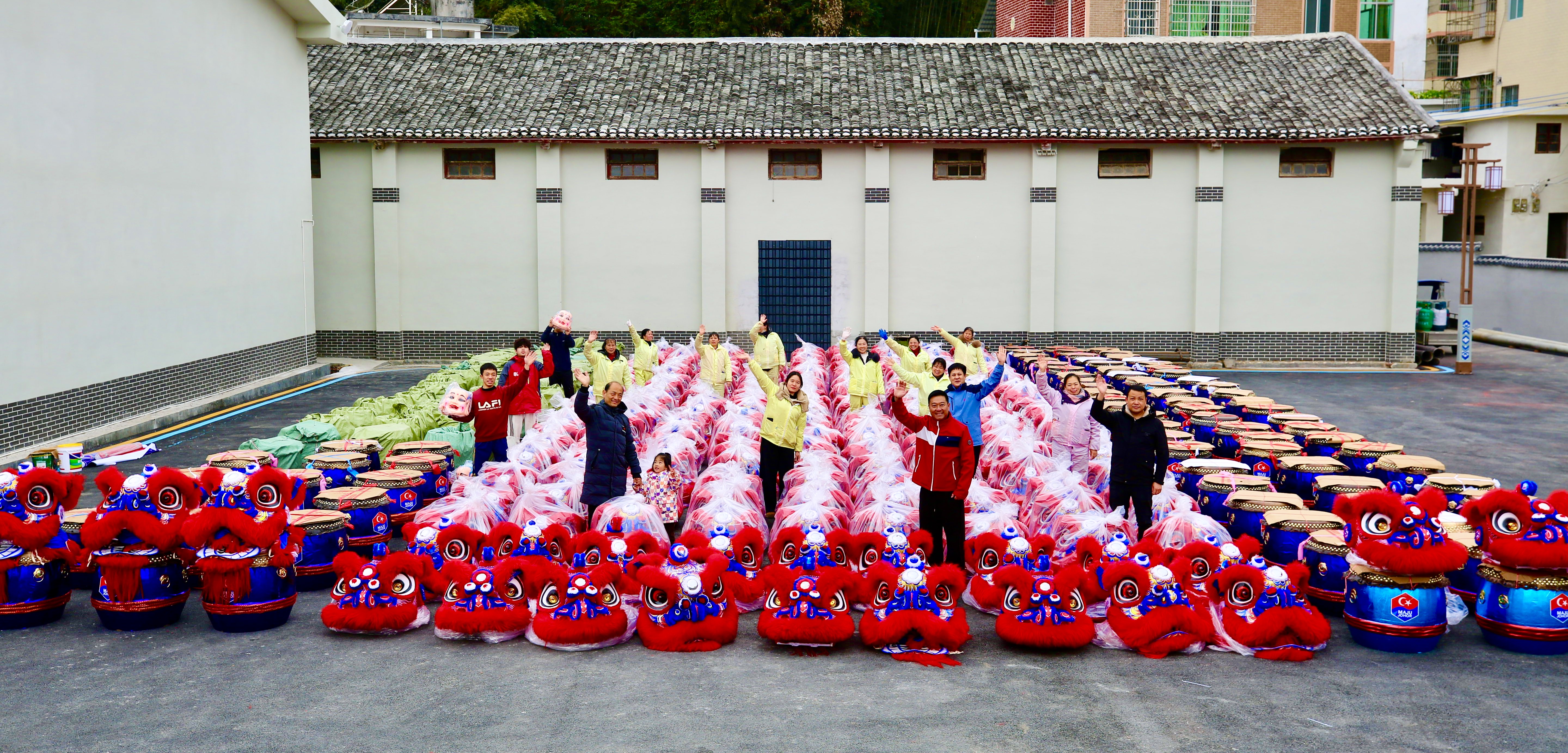 近日,连山太保镇美丽圩镇客厅内,460个手工扎制的醒狮头与230面配套大鼓整齐码放,即将搭乘货柜漂洋过海奔赴马来西亚柔佛州,在2026马年新春佳节,绽放中华醒狮的独特魅力。