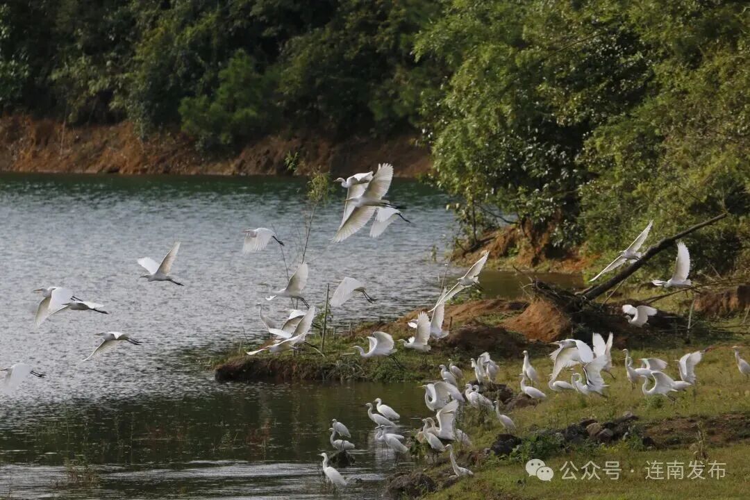 连南板洞省级自然保护区沙木塘水库边,群鸟飞翔。