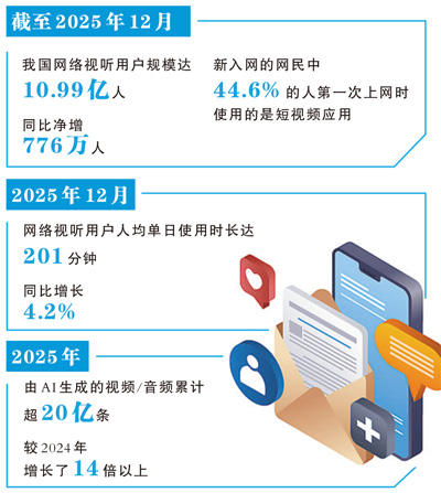 在网民使用率80%以上的主要互联网应用中,短视频唯一实现使用率和用户规模持续双增长。2025年12月,网络视听用户人均单日使用时长达201分钟,同比增长4.2%。其中,微短剧人均单日使用时长达129分钟,已超越长视频,跃居视听细分应用第二位。