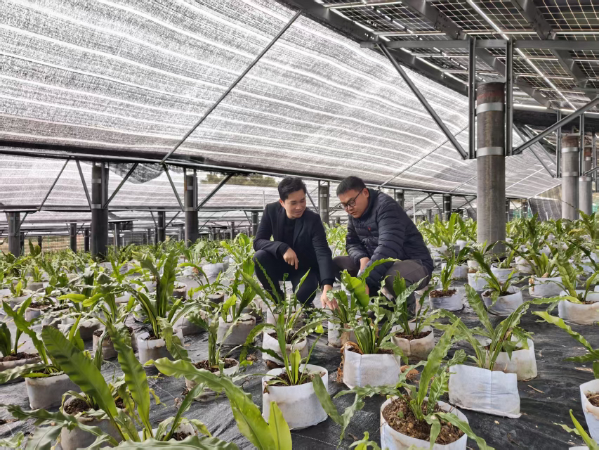 在三坑镇山苏产业园,一排排蓝色光伏板整齐排列,在阳光下熠熠生辉,板下的山苏舒展翠绿叶片,郁郁葱葱、长势喜人。为了提升资源利用率,三坑镇将光伏板下800亩土地二次流转,专门用于山苏种植,2025年,还整合了湴崀、矮车等8个村的光伏资源,盘活2470亩土地实现规模化种植。