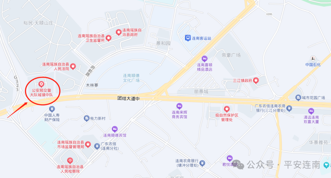 连南瑶族自治县三江镇团结大道中136号(连南瑶族自治县公安局交通管理大队)