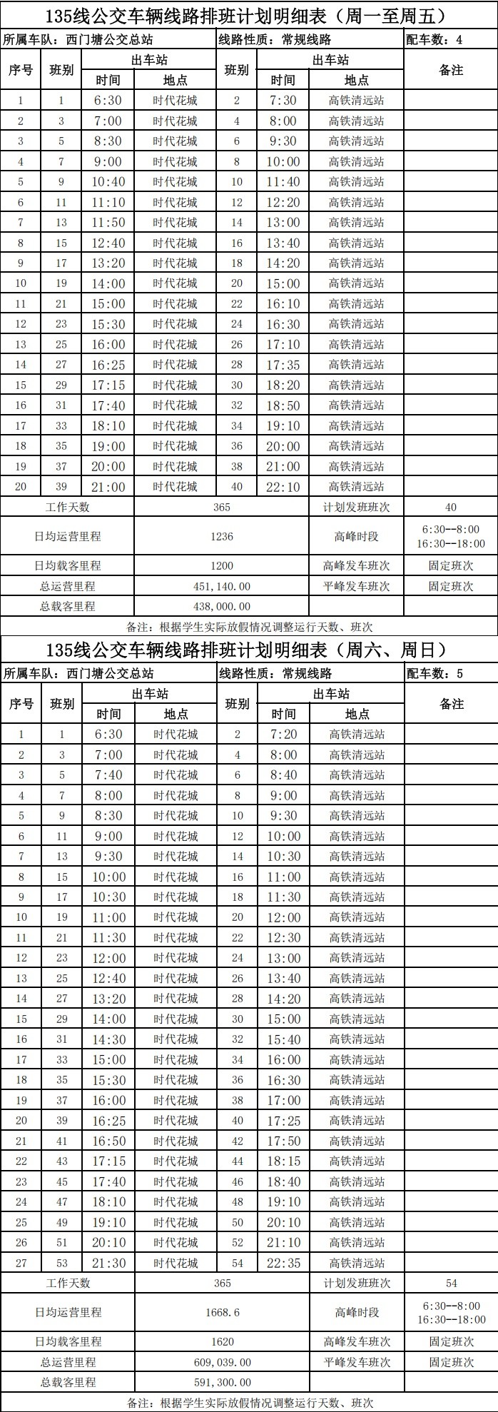 1.135路增加部分站点,周一至周五运行40班,周六日运行54班。为疏散高铁站客流,周六日22:35班次保留,周一至周五该班次取消。
