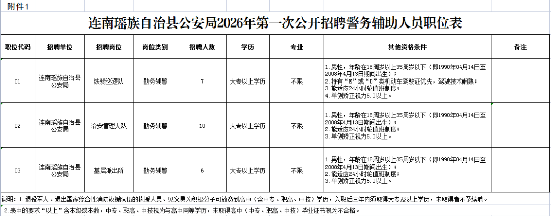 1.连南瑶族自治县公安局2026年第一次公开招聘警务辅助人员职位表。