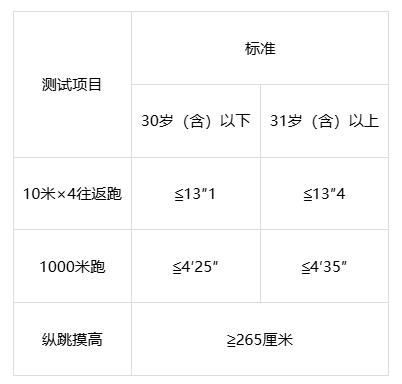 体能测评参照《公安机关录用人民警察体能测评项目和标准》《公安机关录用人民警察体能测评实施规则》执行。测试项目为:10米×4往返跑、1000米跑、纵跳摸高,其中1000米跑的测评次数为1次,10米×4往返跑的测评次数不超过2次,纵跳摸高测评次数不超过3次,测评标准如下表: