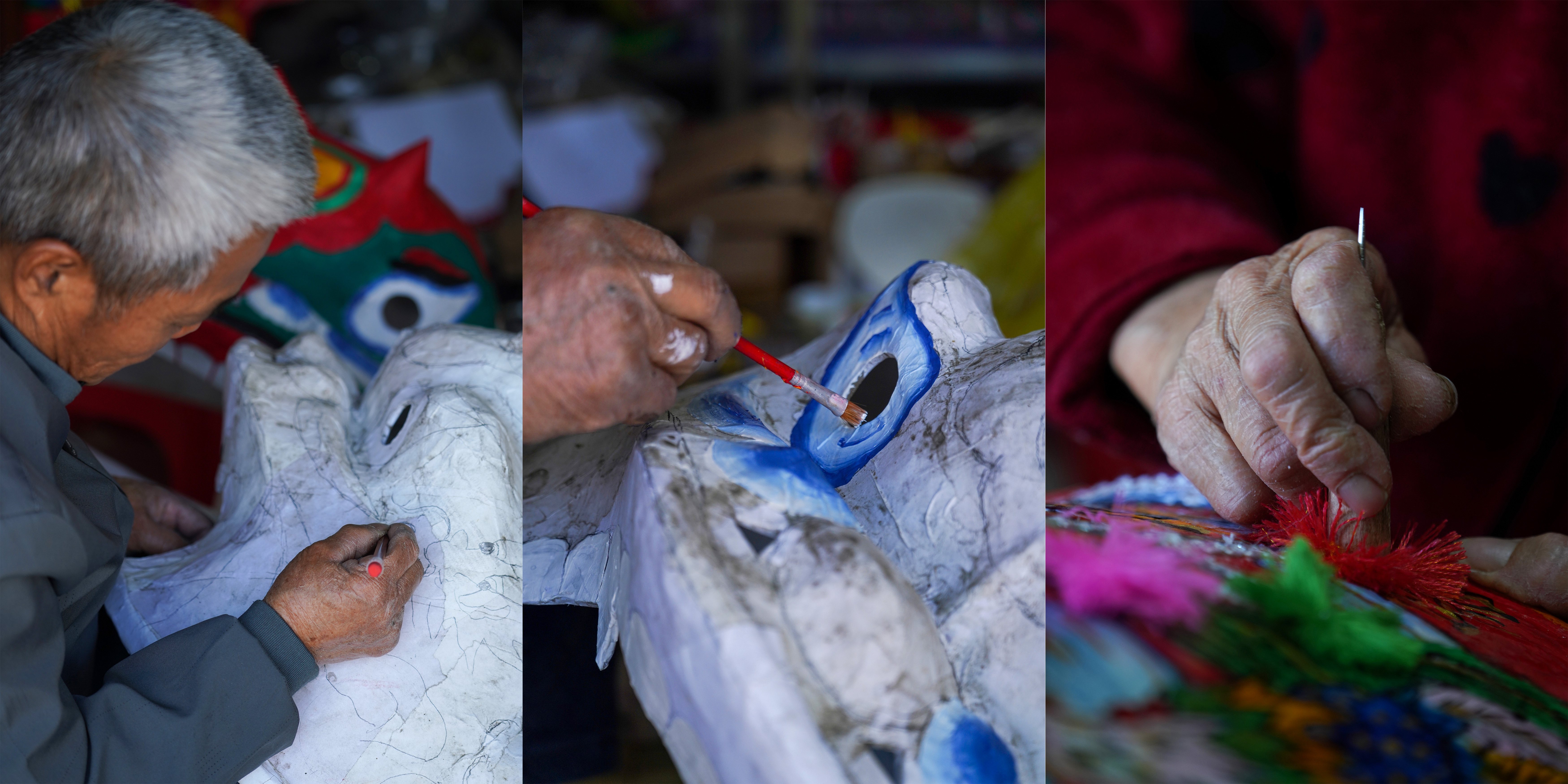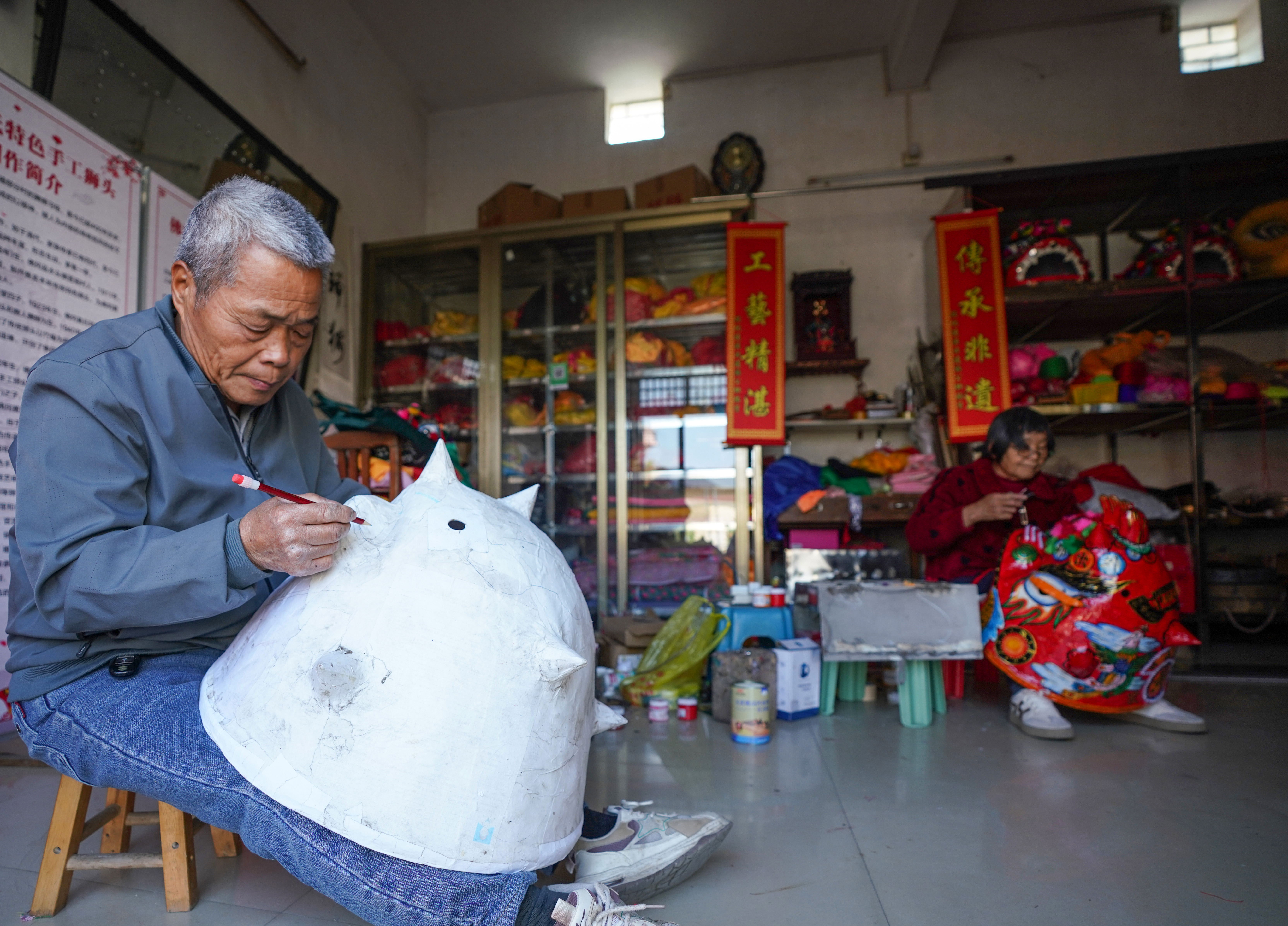 “制作狮头的工序极繁,最考验手艺的一道就是起模,水泥纸与牛皮纸层层裱糊在泥模上,要厚薄均匀,要左右对称。”黄国平介绍道。随后是晾晒、开孔、挖眼耳口鼻、铅笔构图、着色、上油、风干、装饰、拉线成形——十几道工序下来,一个狮头少则一周,多则半月。