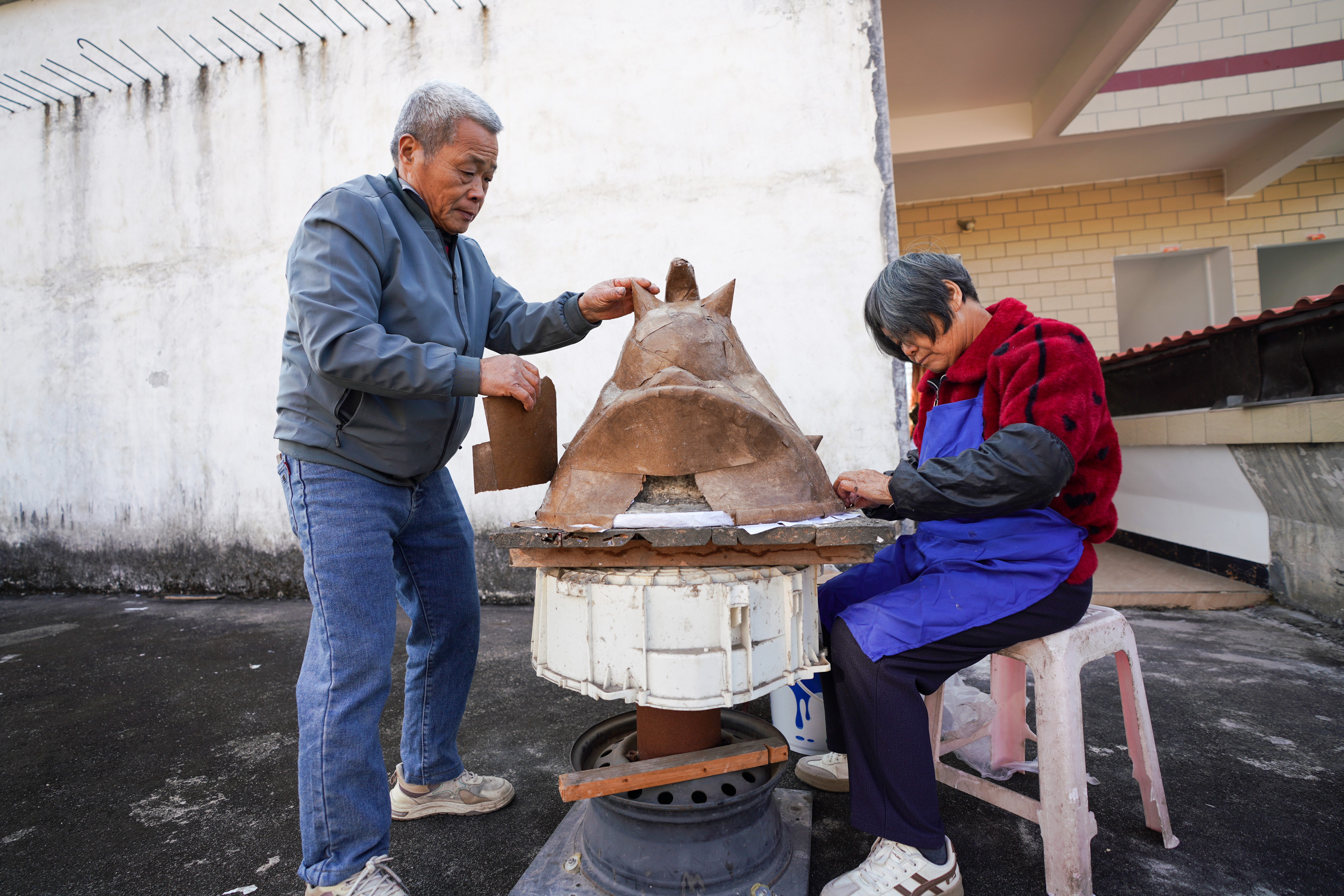 2026年2月2日,黄国平与妻子给狮头底模反复糊上多层纸皮。清远日报记者 刘淑芳 摄