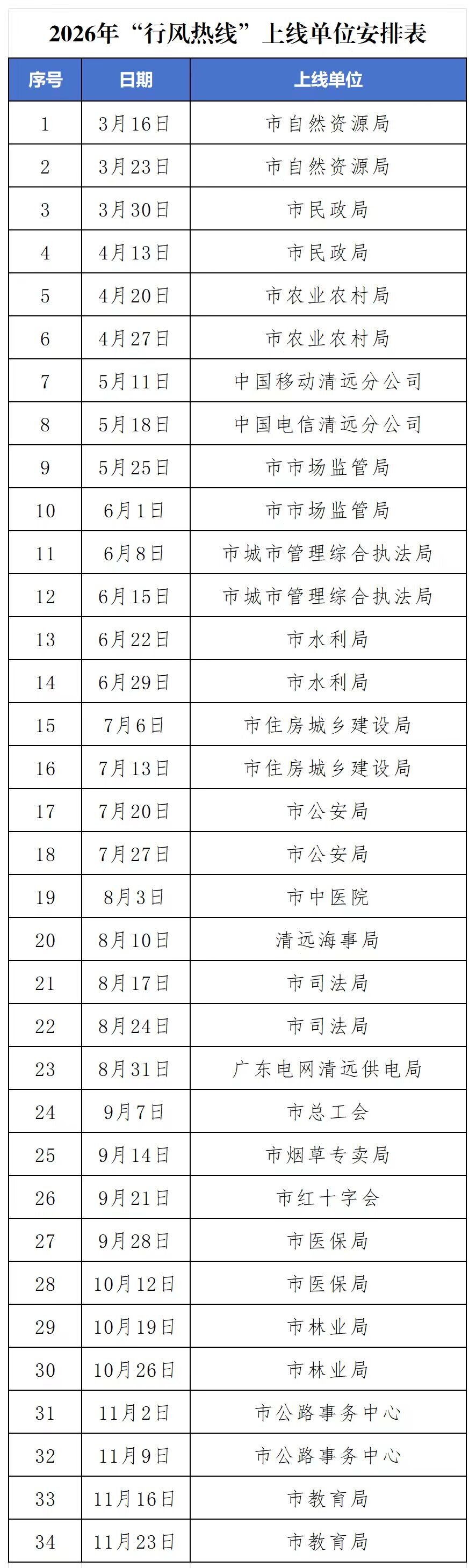 2026年《行风热线》上线单位安排表