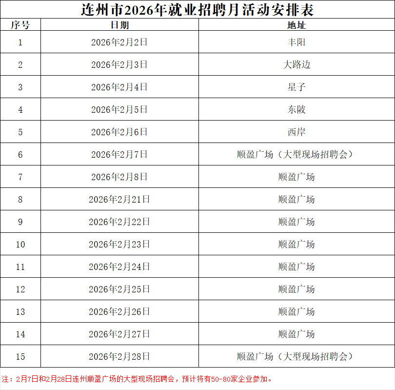为集中帮助高校毕业生、退役军人、就业困难人员等重点群体及本地富余劳动力就业连州市拟在2月开展为期一个月的就业招聘月活动其中,2月7、28日在连州顺盈广场举办的大型现场招聘会预计有50—80家企业参加具体安排如下↓来源:连州发布编辑:陈晓茵校对:洪会强编审:李诚编委:卓小畴 订阅后可查看全文(剩余80%)