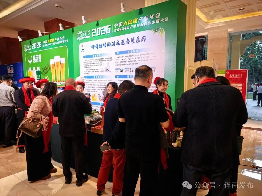 此次年会汇聚了行业权威学者、领军企业及各界代表。连南代表团积极参与年会各项议程,并在会场设立了主题鲜明的特色展位。展位以“瑶山生态,健康之源”为核心设计理念,集中展示了连南丰富的瑶医瑶药资源、一系列食药同源农特产品及深加工成果,生动体现了瑶族传统智慧与现代健康理念的融合。展位前人流络绎不绝,代表团成员与工作人员热情接待每一位来访客商与专业人士,详细阐释连南优越的生态环境、扎实的产业基础以及具有竞争力的招商引资政策,通过近距离、面对面的沟通,使各界嘉宾对连南发展大健康产业的独特优势和合作空间有了真切而深入的了解。