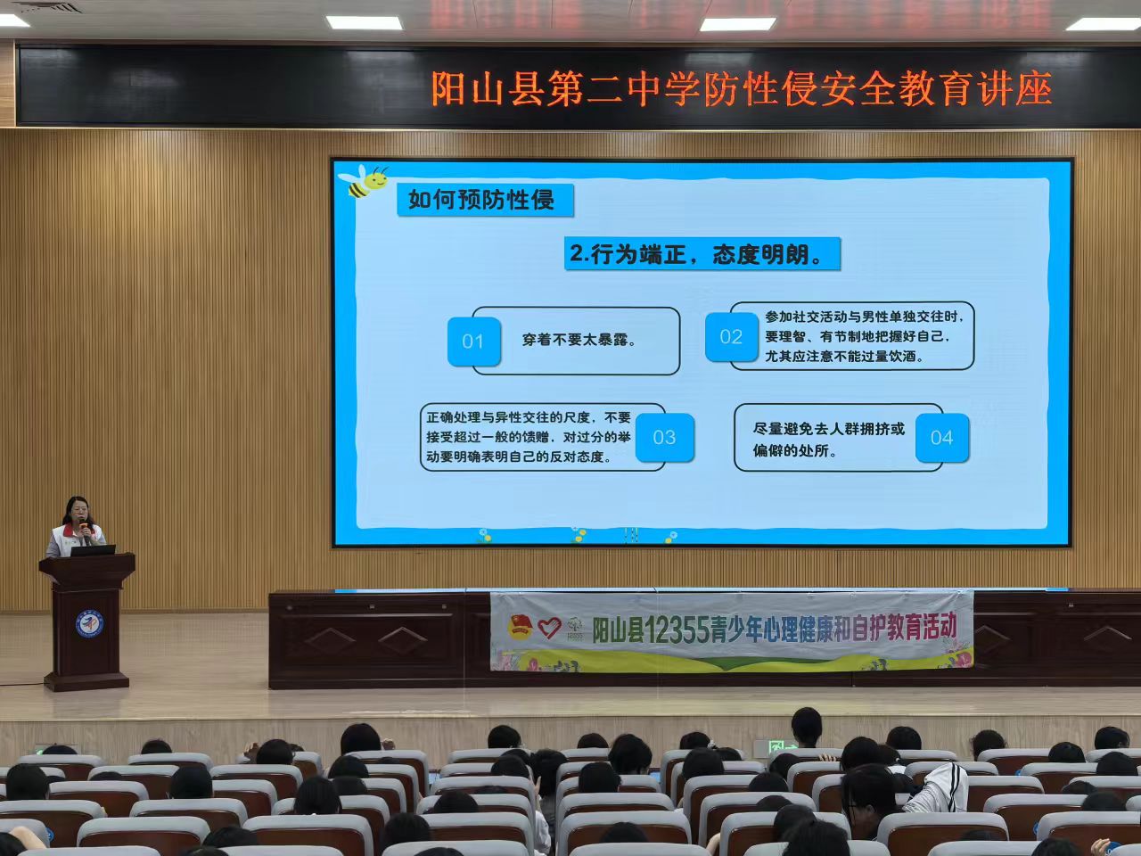 近日,团阳山县委联合阳山县志愿者联合会走进阳山县第二中学,组织开展12355青少年心理健康和自护教育专题活动,为该校七年级的300余名女生带来一堂生动、实用、温暖的青春期健康教育课,推进青少年心理健康与安全自护教育,进一步提升青少年自我保护意识与能力。