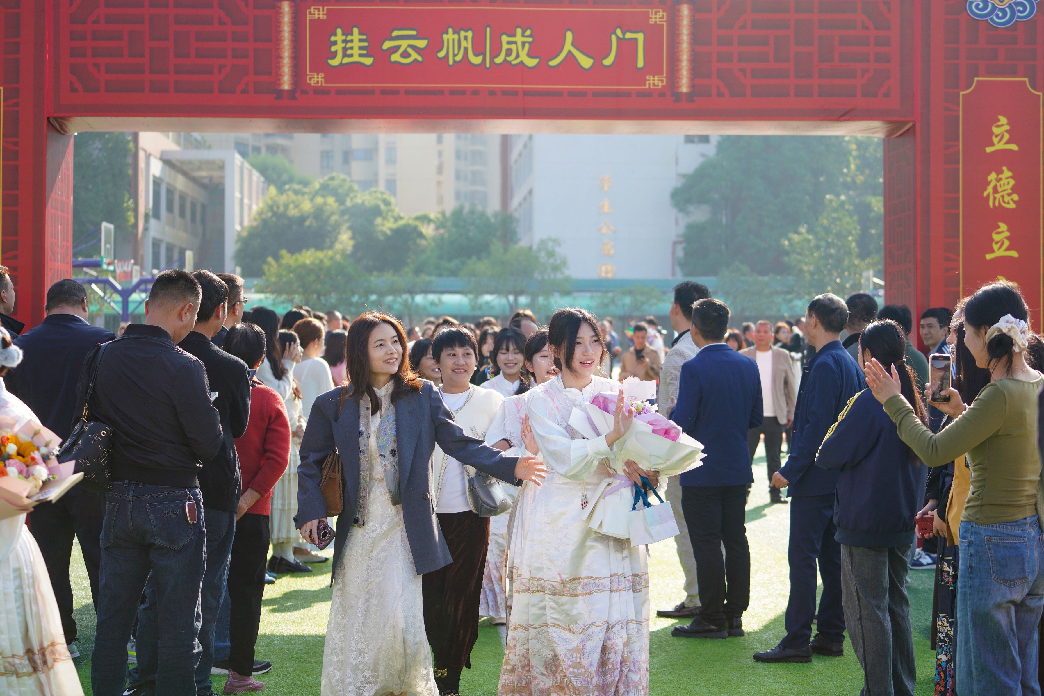 高三16班的学生陈振轩父母从广州回来,陪伴儿子参加成人礼,母亲不仅给儿子准备了鲜花、红包,还买来甘蔗、橙子、粽子送给儿子,祝他“一举高中”“心想事成”,“成年了,希望他今后可以脚踏实地,拼一拼,考上理想大学。家,永远是最他坚强的后盾!”