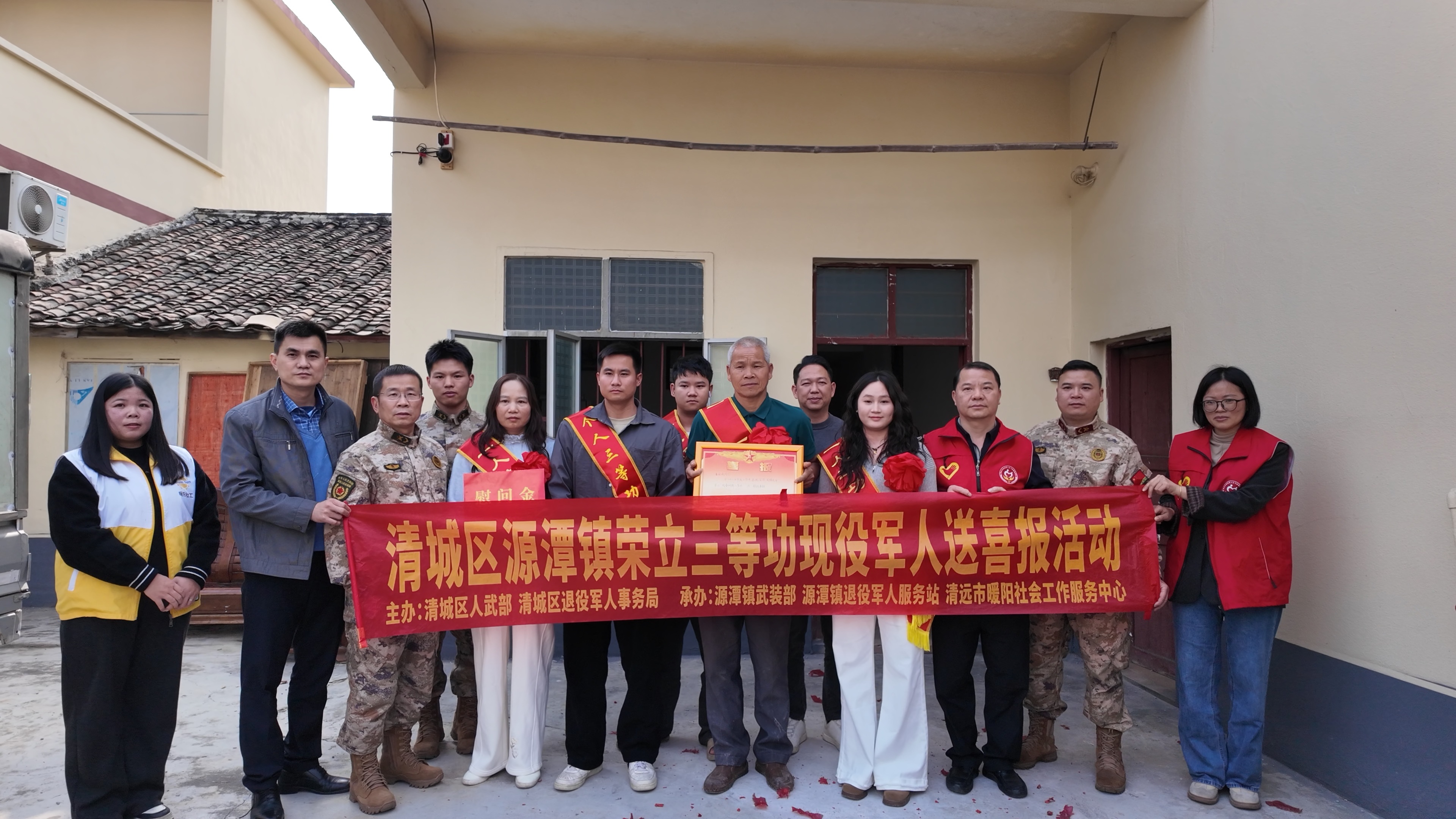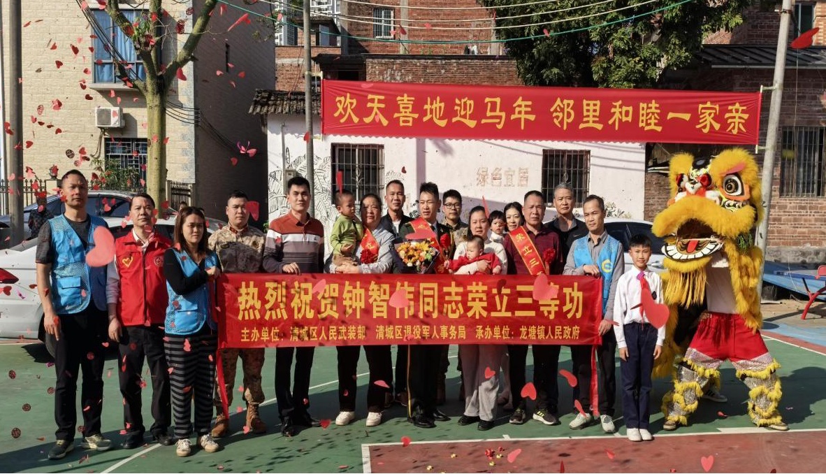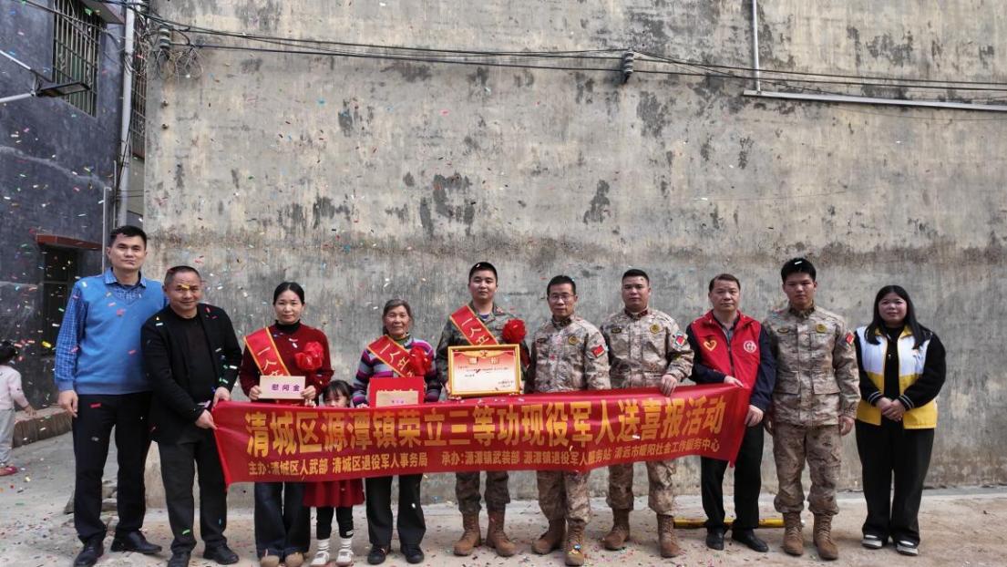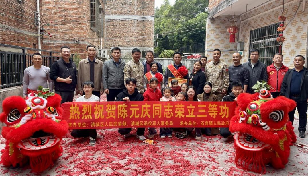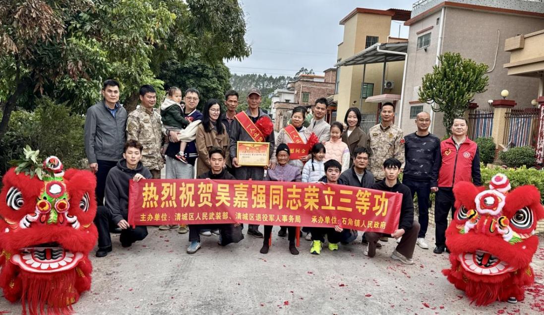 2月12日至13日,清城区退役军人事务局联合区人民武装部及相关镇街,组成慰问团先后来到石角镇、源潭镇、龙塘镇,为荣立三等功的现役军人吴嘉强、陈元庆、潘国威、梁桂洪、钟智伟家庭送去立功喜报和慰问金,以庄重而热烈的仪式,将党和政府的关怀与尊崇送到军属心坎上。