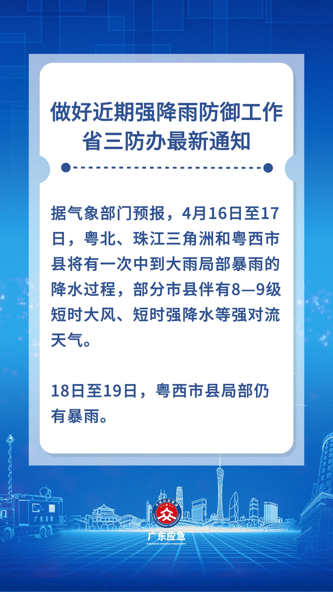据气象部门预报,4月16日至17日,粤北、珠江三角洲和粤西市县将有一次中到大雨局部暴雨的降水过程,部分市县伴有8—9级短时大风、短时强降水等强对流天气。18日至19日,粤西市县局部仍有暴雨。