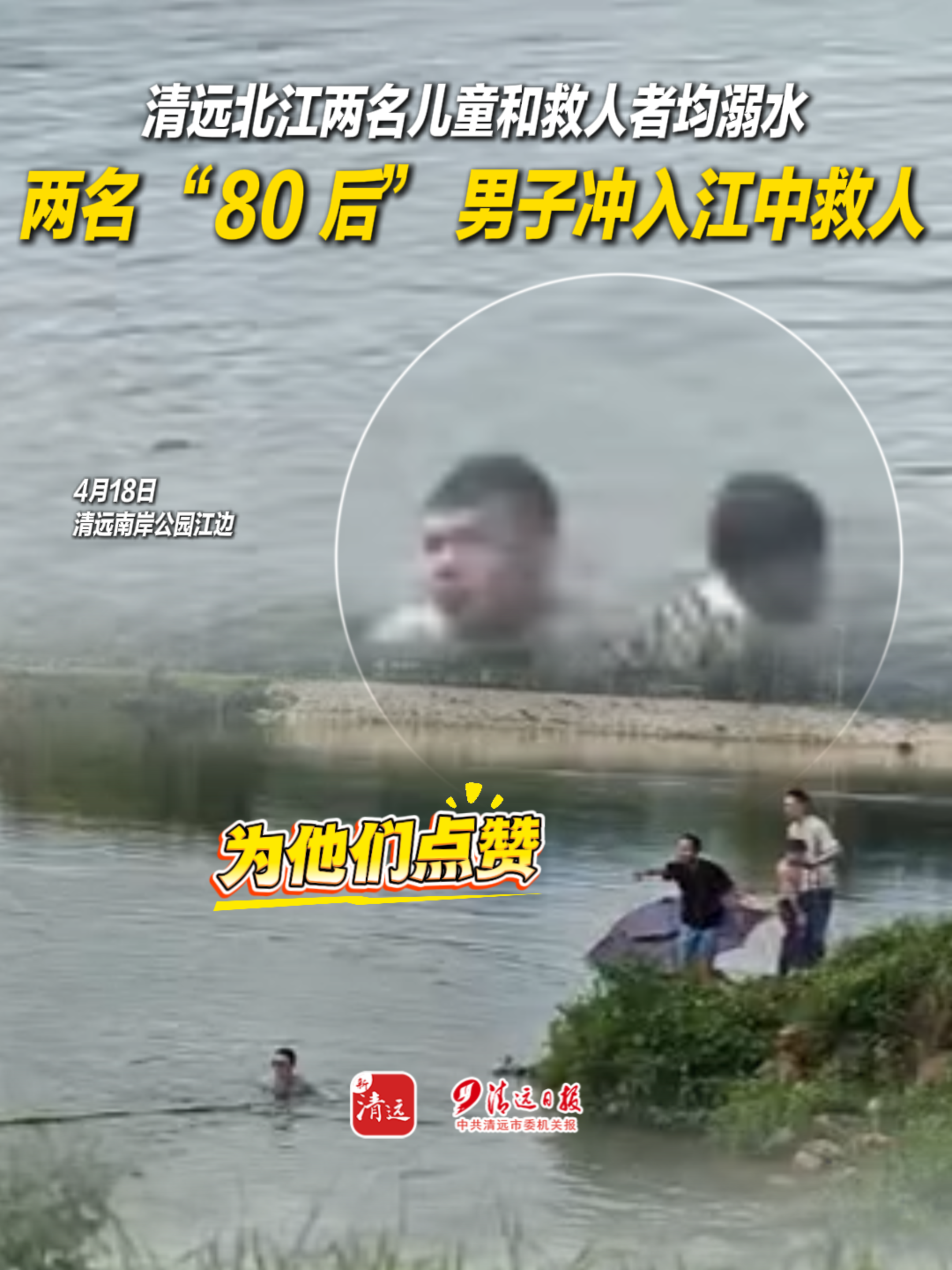4月18日下午3时许,清远市区北江南岸公园江边突发险情:两名在江边玩耍的孩童不慎落水,一名黑衣小伙主动下水施救却因水性不佳陷入险境。危急关头,正在公园垂钓的刘福泉和露营的梁光慧两位清远“80后”男子挺身而出,纵身跃入江中,默契配合、接力施救,与岸上市民合力展开了一场接力救援,三名溺水者最终成功脱险,这段惊心动魄的救援视频在朋友圈和网络刷屏,市民纷纷为清远凡人英雄点赞。