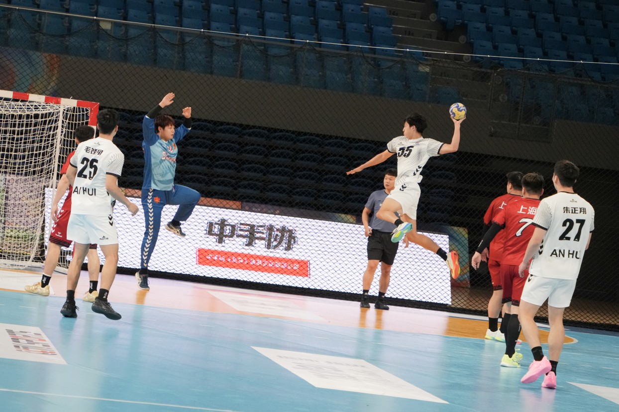 3月29日,2025-2026中国手球超级联赛迪迪羊·清远赛区,安徽队对阵上海队,上海队队员正在进攻。清远日报记者 江元威 摄