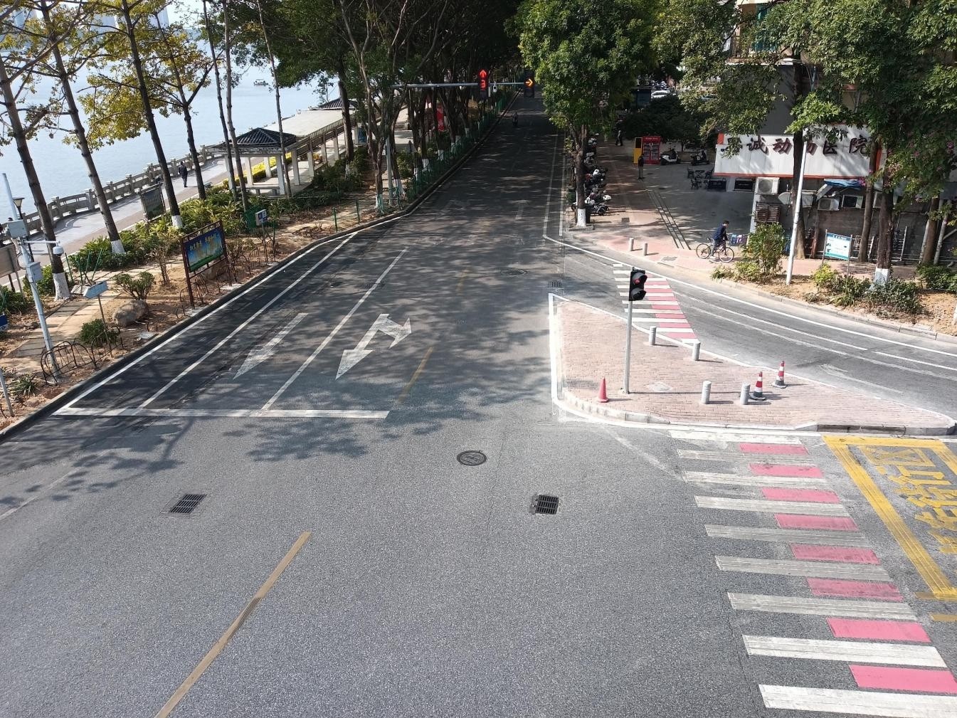 2025年,清城区凤城街道投入30余万元对该路口实施“精准微创”,通过合理缩减局部绿化带、优化人行道空间,在不影响群众出行的前提下,为路口拓展出了宝贵的车道区域,同时施划交通标线与增设导流岛,在关键方向各自新增了一段机动车道。