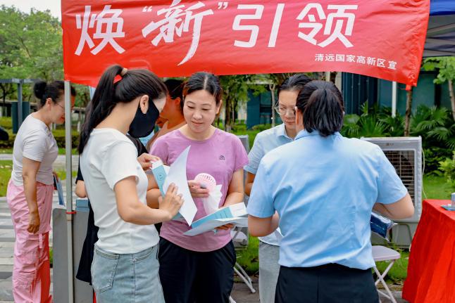 工作人员将宣传制品发放到前来参与活动的员工手中。清远日报记者 彭博 摄