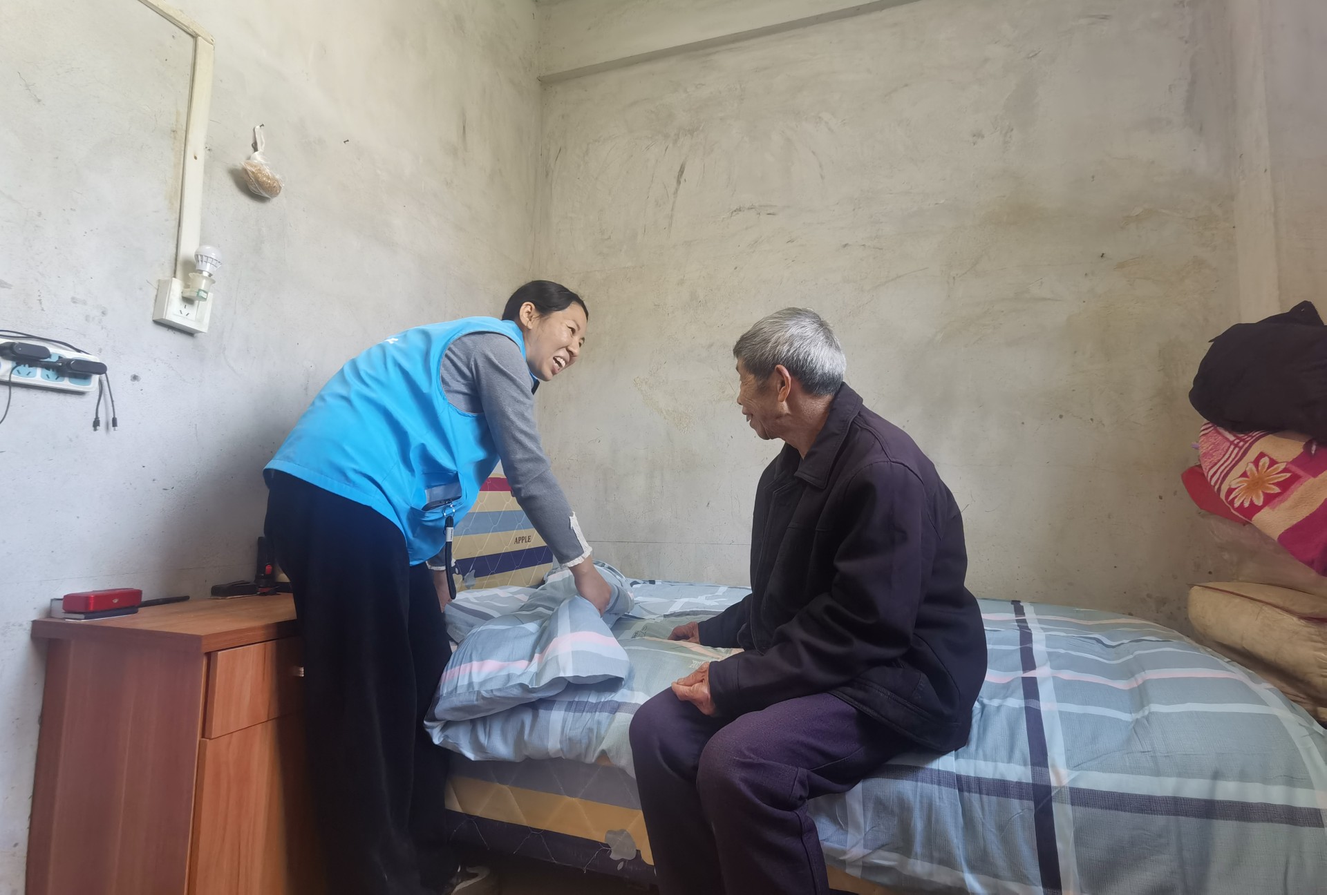 社工和志愿者把新的床垫和棉被一一搬进大家房间。80岁的陈杜生老人坐在床边,用手摸了摸新被子,反复掂量厚度,边点头边高兴说道,“够厚,很暖和!”铺好床后,热气腾腾的饭菜端上桌,大家一边吃饭、一边聊天,院子里好不热闹。