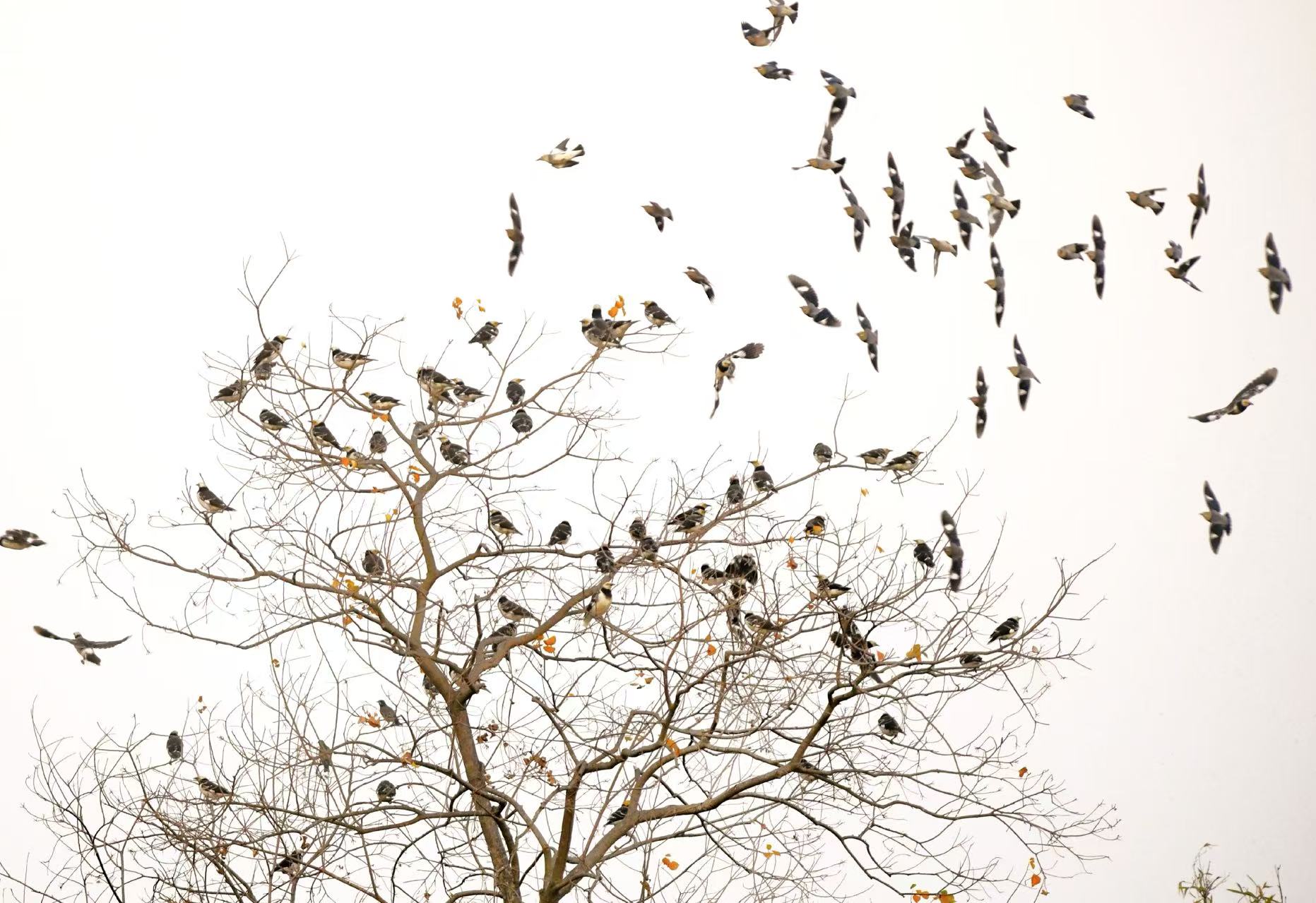 2026年2月1日,清新区山塘镇碧沙岛,一群椋鸟飞向树。清远日报签约摄影师 骆志刚 摄