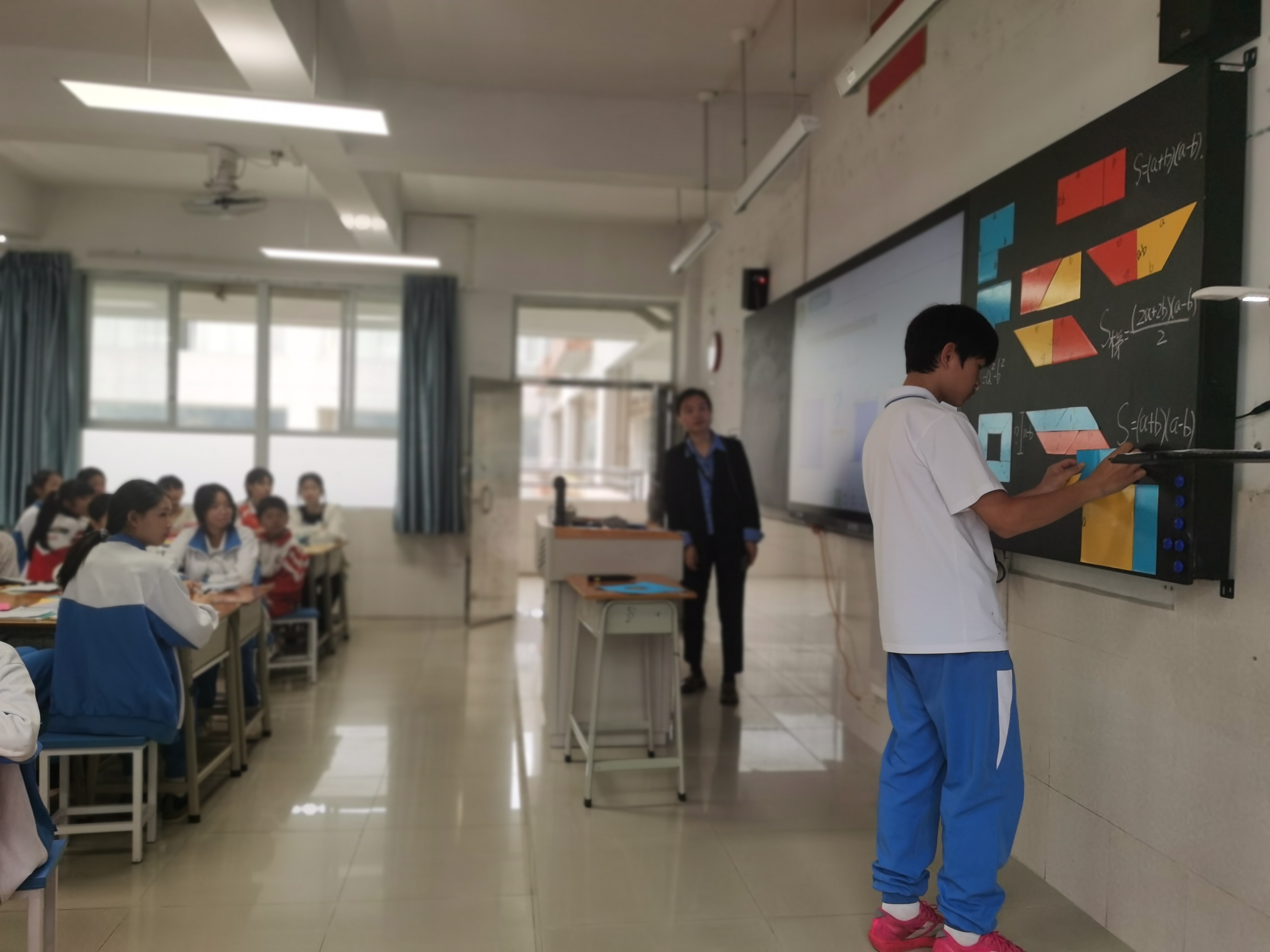 在数学《平方差公式》贯通式课堂上,学生们分成六个小组围坐在一起,桌面上摆放着学习道具。授课教师李静,打破了传统课堂的单向讲授模式,通过精准提问引导学生主动思考、动手操作。结合课前布置的学习任务单,李静引导学生从几何图形面积角度出发,通过剪拼等实践步骤,自主推导并验证平方差公式。整个过程中,李静充分发挥引导者、组织者的作用,鼓励学生小组内交流探讨、互助协作、上台展示。“这样的课堂很生动,更能让我集中注意力,数形结合的方式也让我更清晰地掌握了平方差公式。”该校七年级学生任依琳说道。