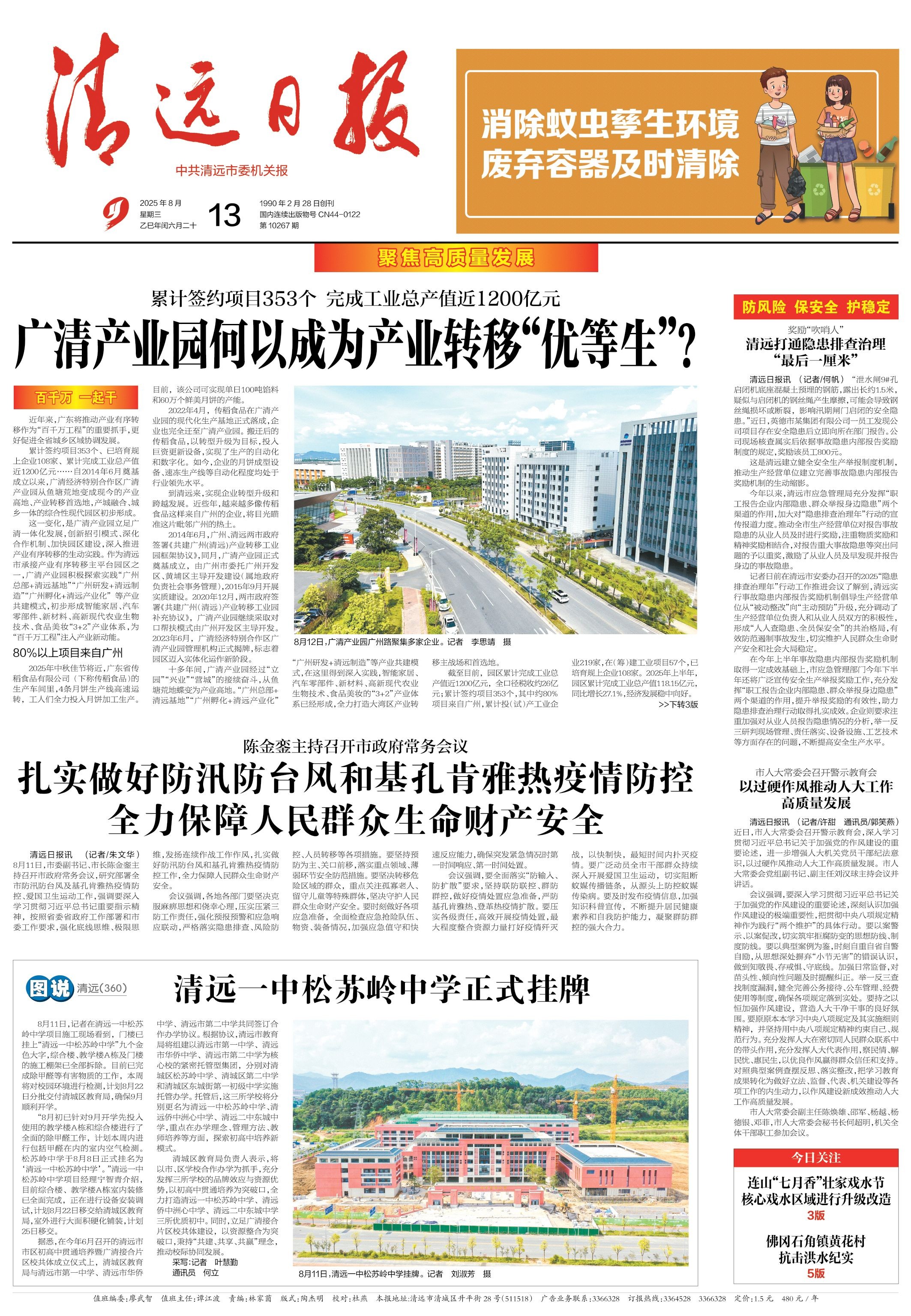 2025年8月13日《清远日报》头版。