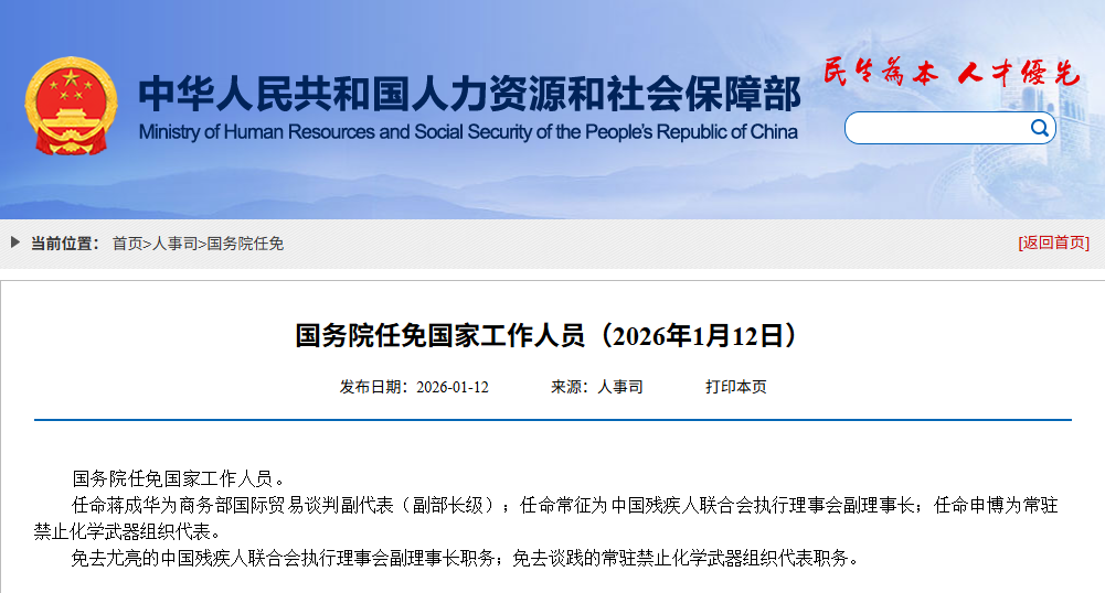 据人社部网站1月12日消息,国务院任免国家工作人员——任命蒋成华为商务部国际贸易谈判副代表(副部长级);任命常征为中国残疾人联合会执行理事会副理事长;任命申博为常驻禁止化学武器组织代表。免去尤亮的中国残疾人联合会执行理事会副理事长职务;免去谈践的常驻禁止化学武器组织代表职务。来源:长安街知事编辑:郭然天校对:韦其安编审:刘厚斌编委:廖武智 订阅后可查看全文(剩余80%)