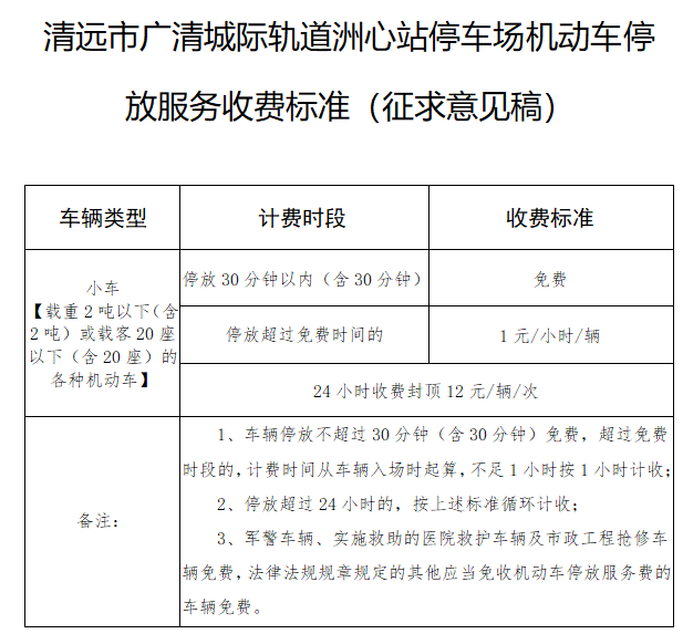 清城区发展和改革局解释,根据《关于印发<清远市机动车停放服务收费管理实施细则>的通知》第十四条规定,进入机场、车站、码头等配套停车设施停车不超过30分钟的免收机动车停放服务费。即政府定价管理的车站配套停车场停放免费时间为不超过30分钟。由于车站、机场等交通站场停车需求量大,为鼓励和引导车辆短停快走,设置30分钟的免费停放时间更加科学合理。同时根据城轨洲心站经营企业运营测算成本情况,依据停车实施建设运营成本、市场供求状况等因素综合考虑后设施的24小时封顶收费为12元/辆/次。该封顶收费标准对比政府定价和市场调节价的停车场收费标准已明显低价,在科学合理的标准范围。