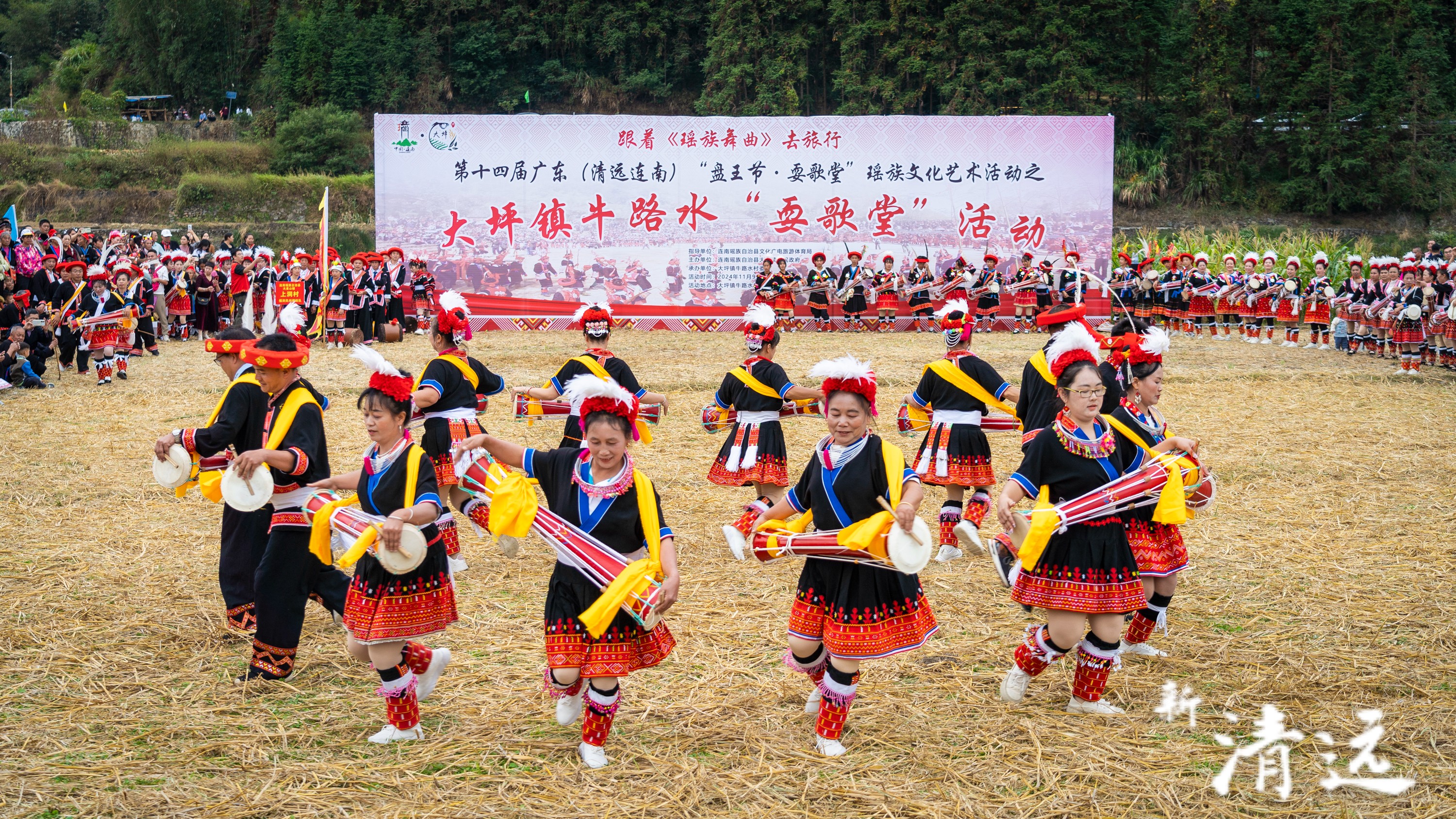 连南大坪镇盘王节期间,村民在表演长鼓舞。资料图。