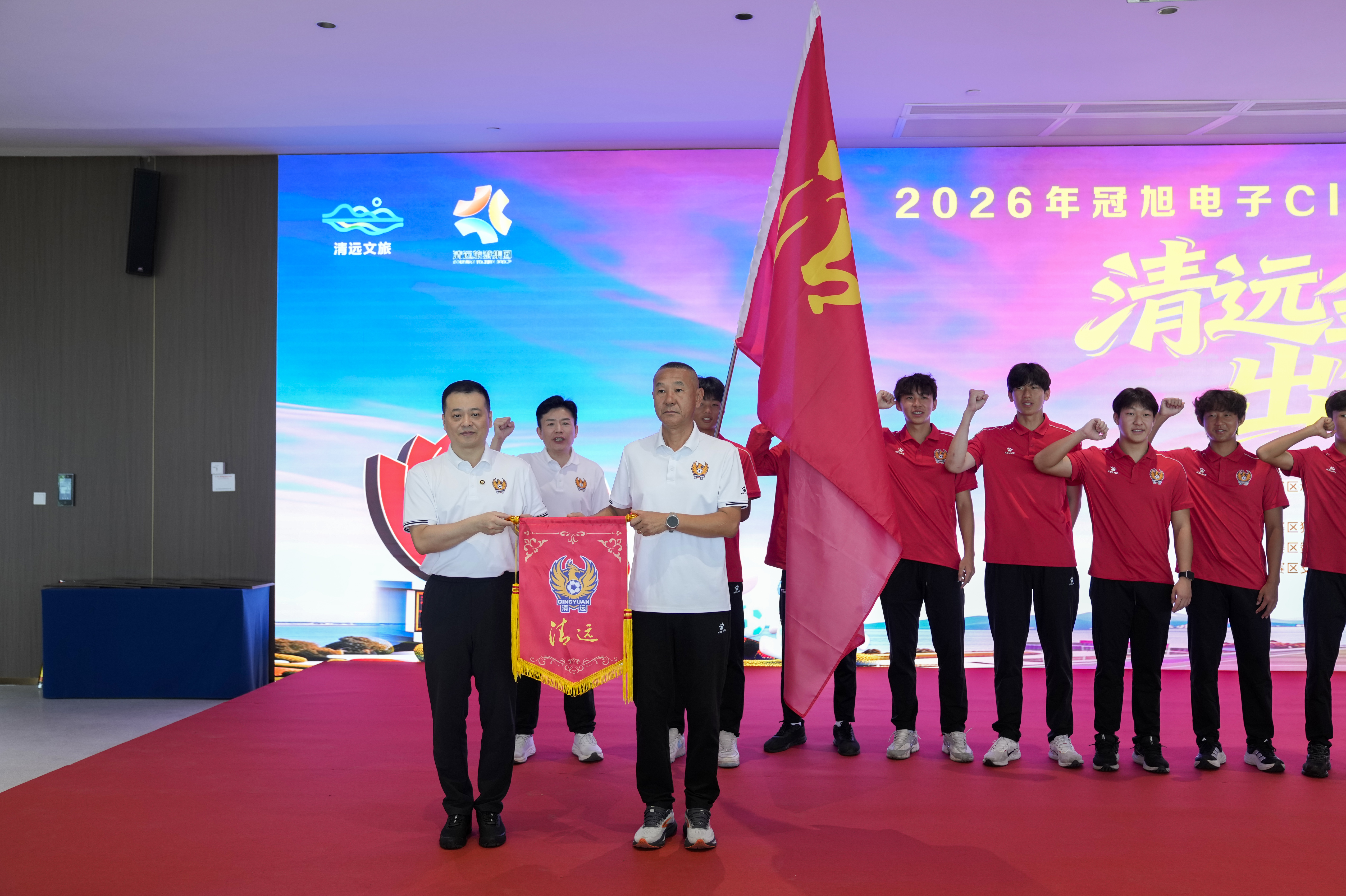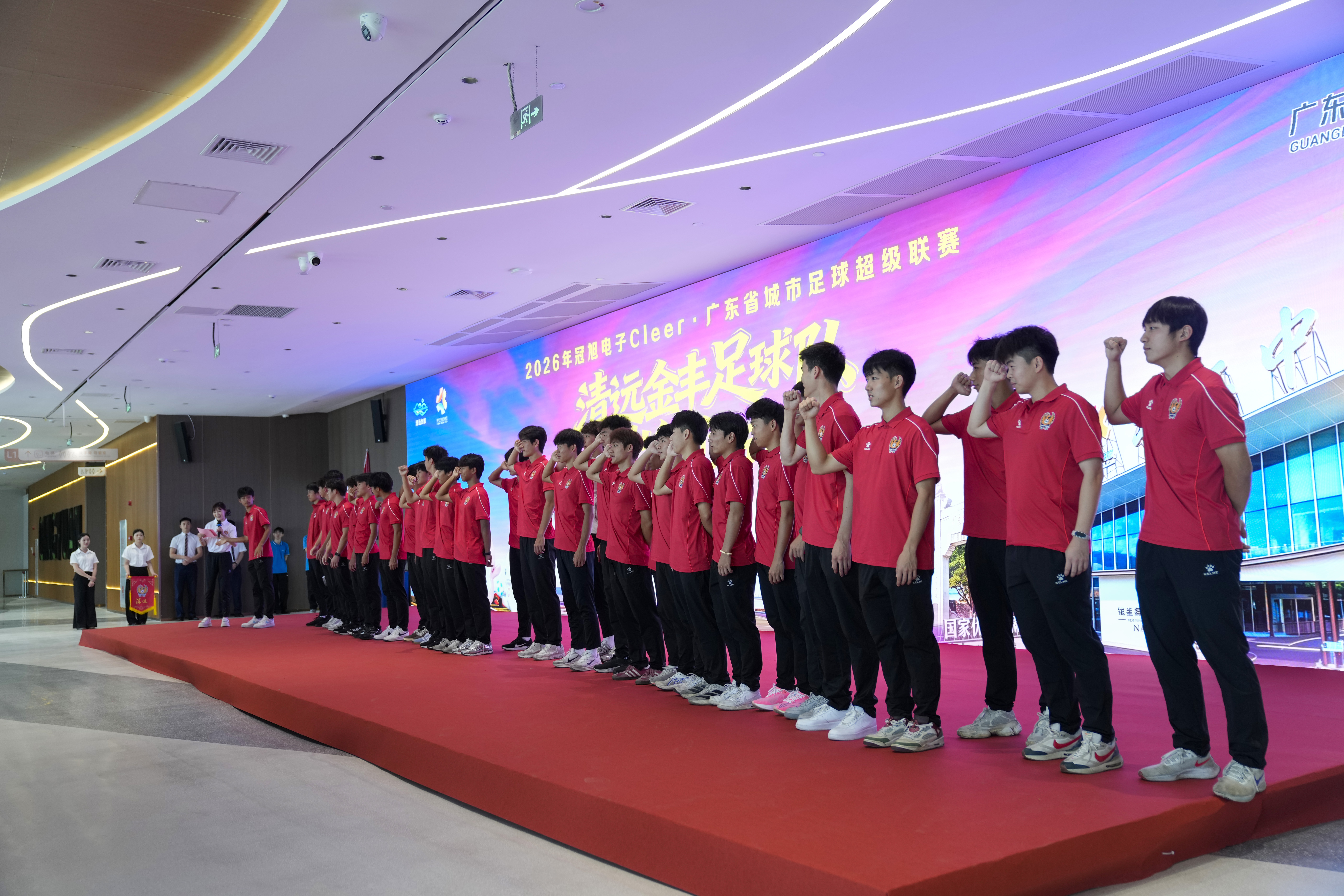 “清远清远,奋勇争先!”4月18日上午,2026年广东省城市足球超级联赛(“粤超”)清远队出征仪式现场,清远队全体队员庄严宣誓、高喊出征口号,并明确以争冠为目标,为清远荣誉而战。
