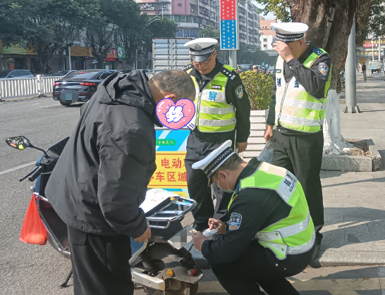 连州交警在慧光小学周边路段开展电动自行车、摩托车现场整治+劝导教育行动。对未佩戴安全头盔、违规载人载物、逆向行驶的群众进行耐心劝阻,讲解安全出行要点,引导群众文明骑行,守护出行平安。