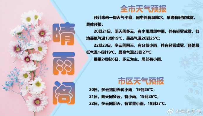 @清远天气 预计,未来一周清远天气平稳,间中伴有弱降水,早晚有轻雾或雾。详细预报如下: