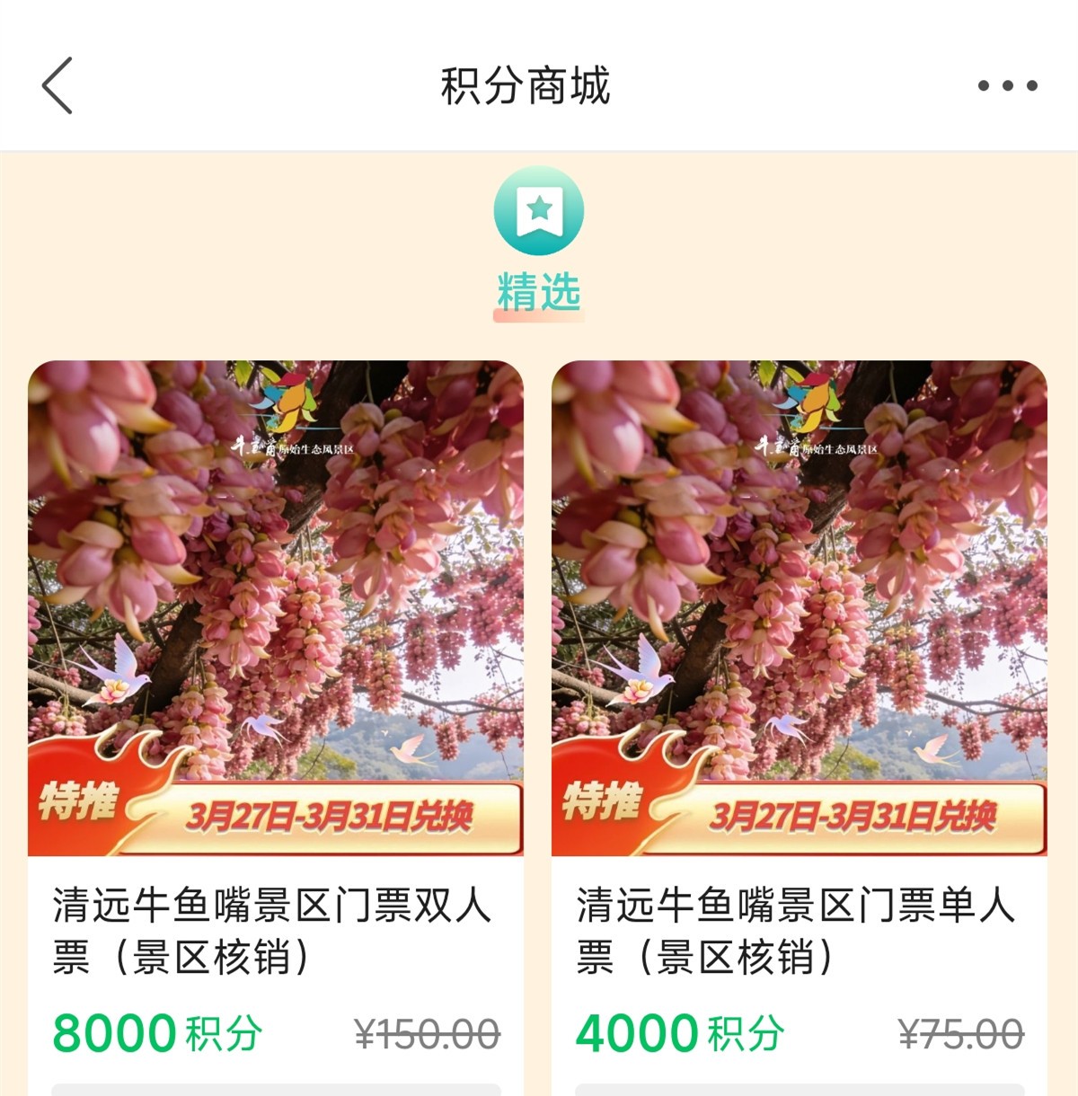 新清远积分商城惊喜“放送”,3月27日-31日,准点抢赏花季特推牛鱼嘴风景区门票,数量有限,先兑先得。定好闹钟,拼手速啦~
