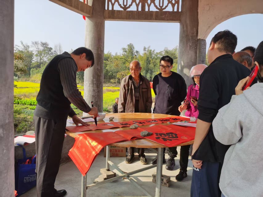 维塘村村口的清溪亭,承载着村民捐资建桥的团结记忆。工作队以清溪亭为核心打造村口公园,借春节契机激活文化阵地:免费提供摊位打造新春小市场,本土农特产、儿童玩具一应俱全,村民与返乡游子赶集游玩,热闹非凡;驻村第一书记杨志强现场挥毫,书写春联福字赠予乡亲,墨香里传递着新春祝福与文化温情。工作队还牵头举办村级答谢会,引导乡村热心人士捐赠1.5万元支持公益事业,让社会各界力量成为乡村发展的助推器。