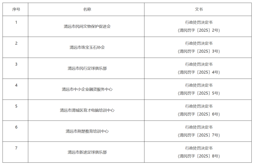 以下7家单位存在连续多年不按照规定时间和要求向登记管理机关报送年度工作报告的行为,违反了《民办非企业单位登记管理暂行条例》第二十三条第一款、《社会团体登记管理条例》第二十八条第一款等有关规定。且这些单位未在规定期限内作出陈诉、申辩或要求听证,依据有关规定,清远市民政局决定对这些单位作出撤销登记的行政处罚。