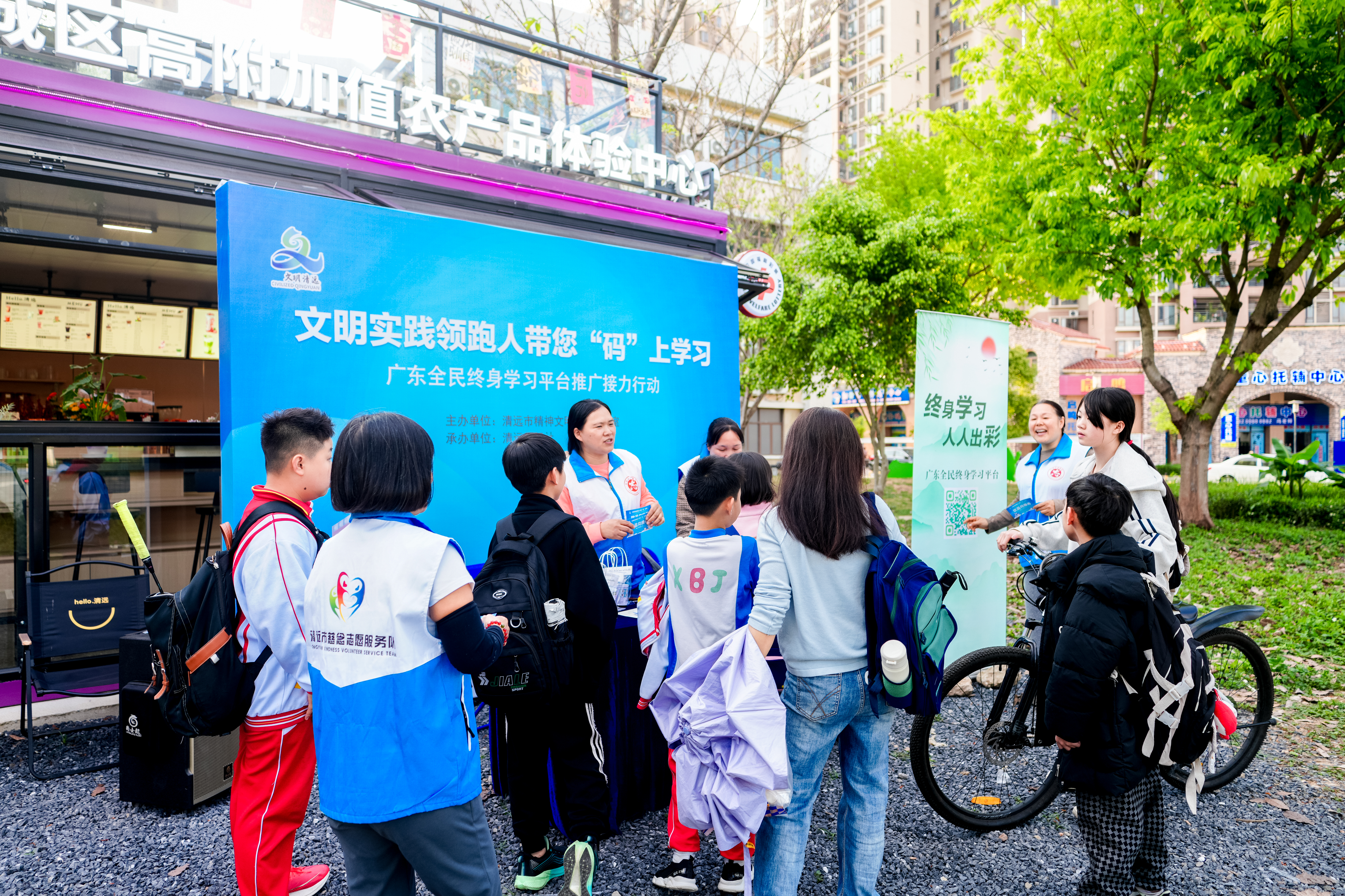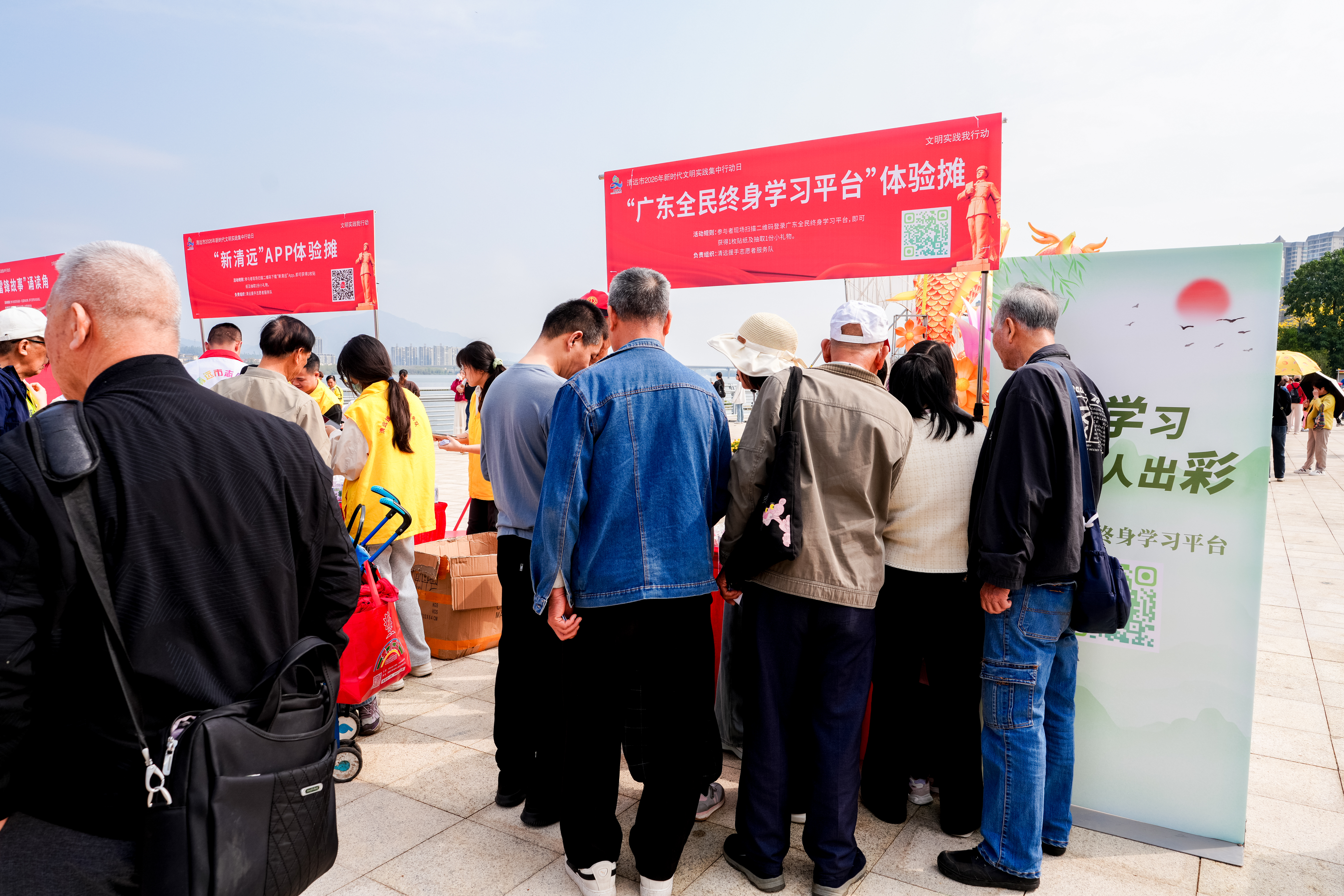 3月7日上午,专题宣传推广活动在清远市南岸公园正式拉开序幕。结合清远市“学雷锋”主题集市活动,新时代文明实践领跑人率先行动,在熙攘的公园人流中设立宣传点,引导市民扫码关注“广东全民终身学习平台”。