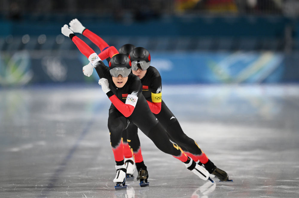 2月15日,中国队选手刘瀚彬、吴宇、李文淏(从前至后)在速度滑冰男子团体追逐四分之一决赛中。新华社记者 武巍 摄